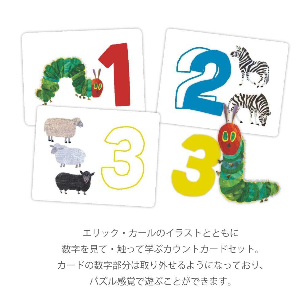 エリック・カールのイラストとともに数字を見て・触って学ぶカウントカードセット。 カードの数字部分は取り外せるようになっており、パズル感覚で遊ぶことができます。 1から10までの数字を楽しく覚えることができます。 本製品はヨーロッパの安全基準CEに適合しており、小さなお子様でも安全にお使いいただけます。 (C) (YEAR) Penguin Random House LLC. ERIC CARLE, THE VERY HUNGRY CATERPILLAR, THE WORLD OF ERIC CARLE logo, the Caterpillar logo and related designs, logos, and names are trademarks and/or registered trademarks of Penguin Random House LLC. All rights reserved. “The Very Hungry Caterpillar” is published by Penguin Random House LLC.” (C) (YEAR) Penguin Random House LLC. ERIC CARLE, THE WORLD OF ERIC CARLE logo, and related designs, logos, and names are trademarks and/or registered trademarks of Penguin Random House LLC. All rights reserved. “Insert Bear Book Title” written by Bill Martin Jr. is published by Henry Holt and Company, Inc. (C) (YEAR) Penguin Random House LLC. ERIC CARLE, THE WORLD OF ERIC CARLE logo, and related designs, illustrations, and names are trademarks and/or registered trademarks of Penguin Random House LLC. All rights reserved.