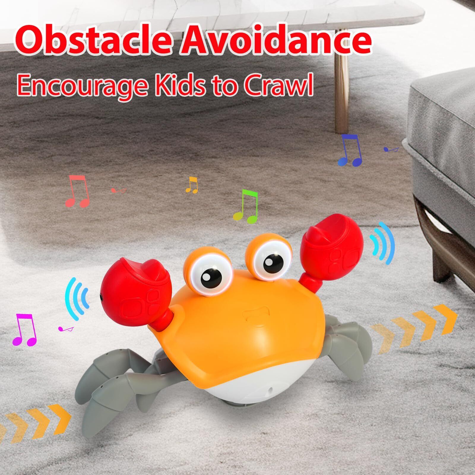 【ミュージカルハイハイおもちゃ】愛らしいカニのおもちゃの幼児用おもちゃは、障害物(テーブル、手、足など)に遭遇すると、自動的に反対方向に走り去ります。 お子様のハイハイを促すインタラクティブな音楽玩具で、運動能力や手と目の協調性の発達にも役立ちます