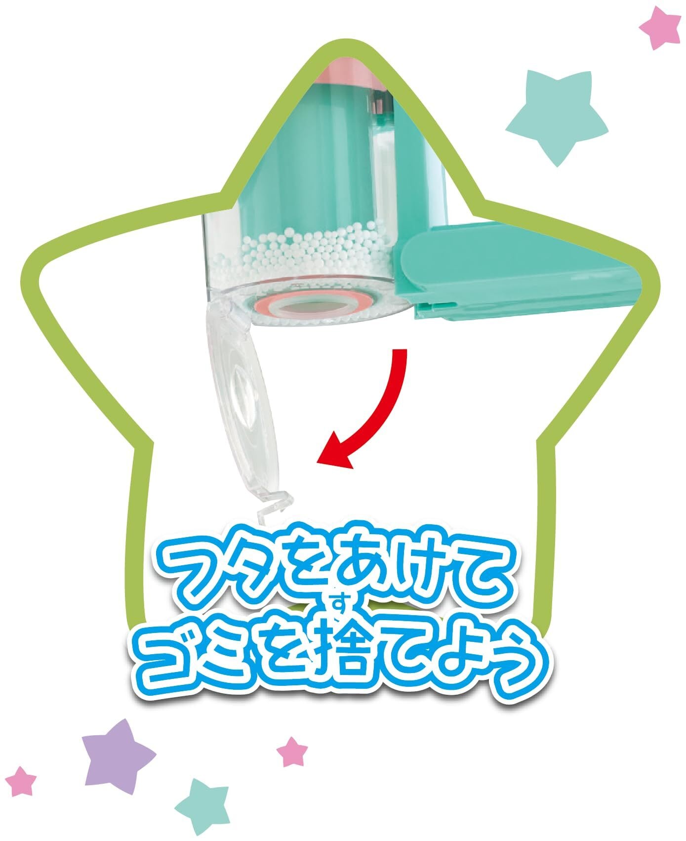 お手伝いの練習に最適なそうじきセットです。ボタンを押すとやさしく吸い込み、中の発泡スチロールが回転します。