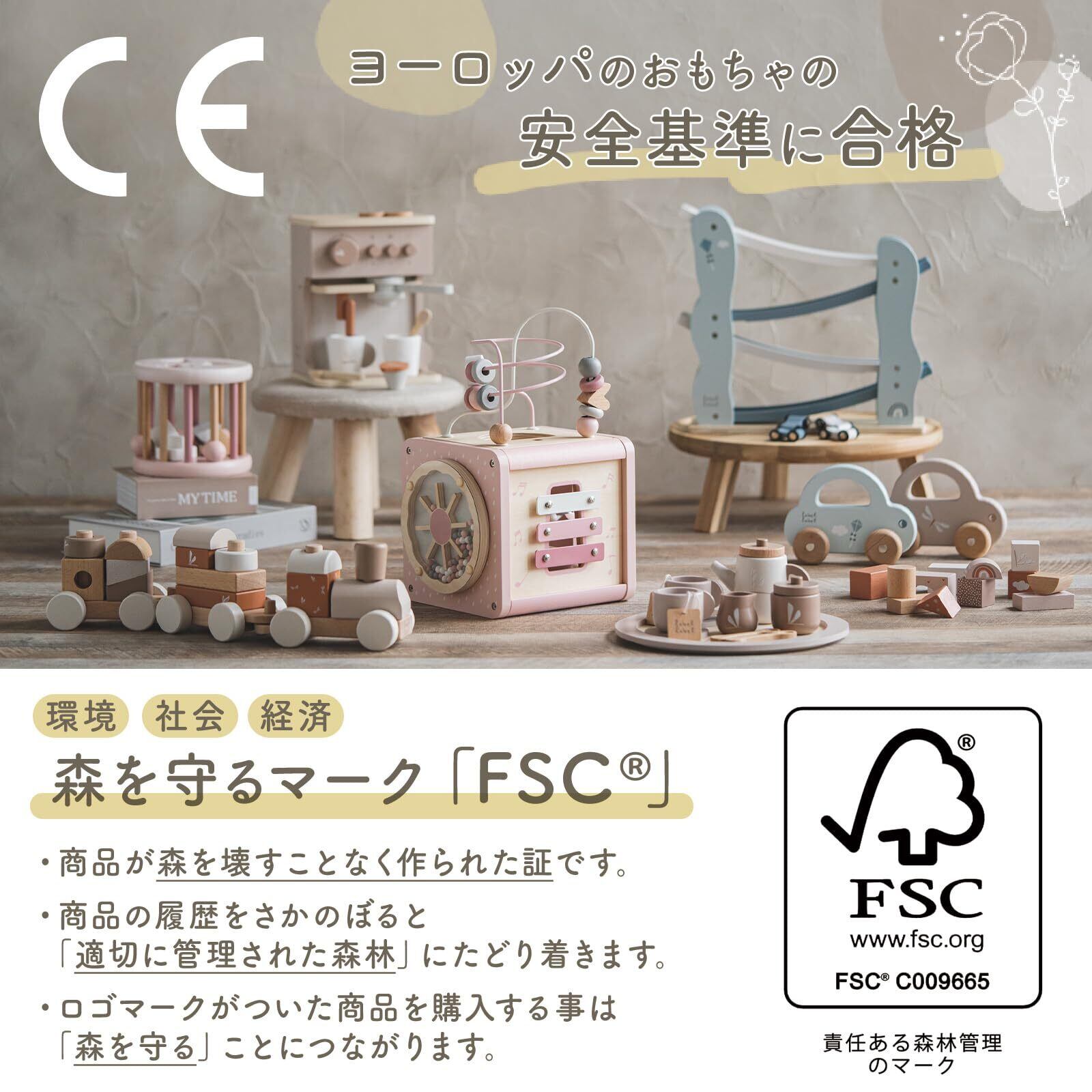 【素材】FSCブナ材、FSC MDF、FSC合板 【安全基準】ヨーロッパの安全基準EN71「CE」および日本の食品衛生法合格
