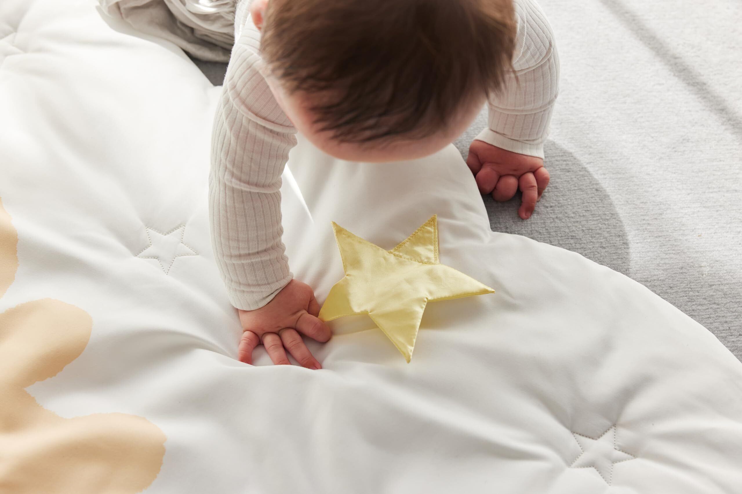 赤ちゃんが大好きなカシャカシャ音のする星や、おもちゃが取り付けられるループ付き。