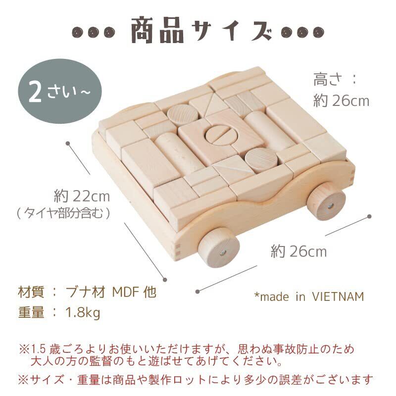 【特価商品】木製おもちゃのだいわ 積木車 [4cm基尺] [無塗装積木32個セット] 台車付き 積木の形は9種類 積み木 ブロック 積木 0歳 2歳 3歳 木のおもちゃ 塗装無し 引き車 お片付け | BOSSO