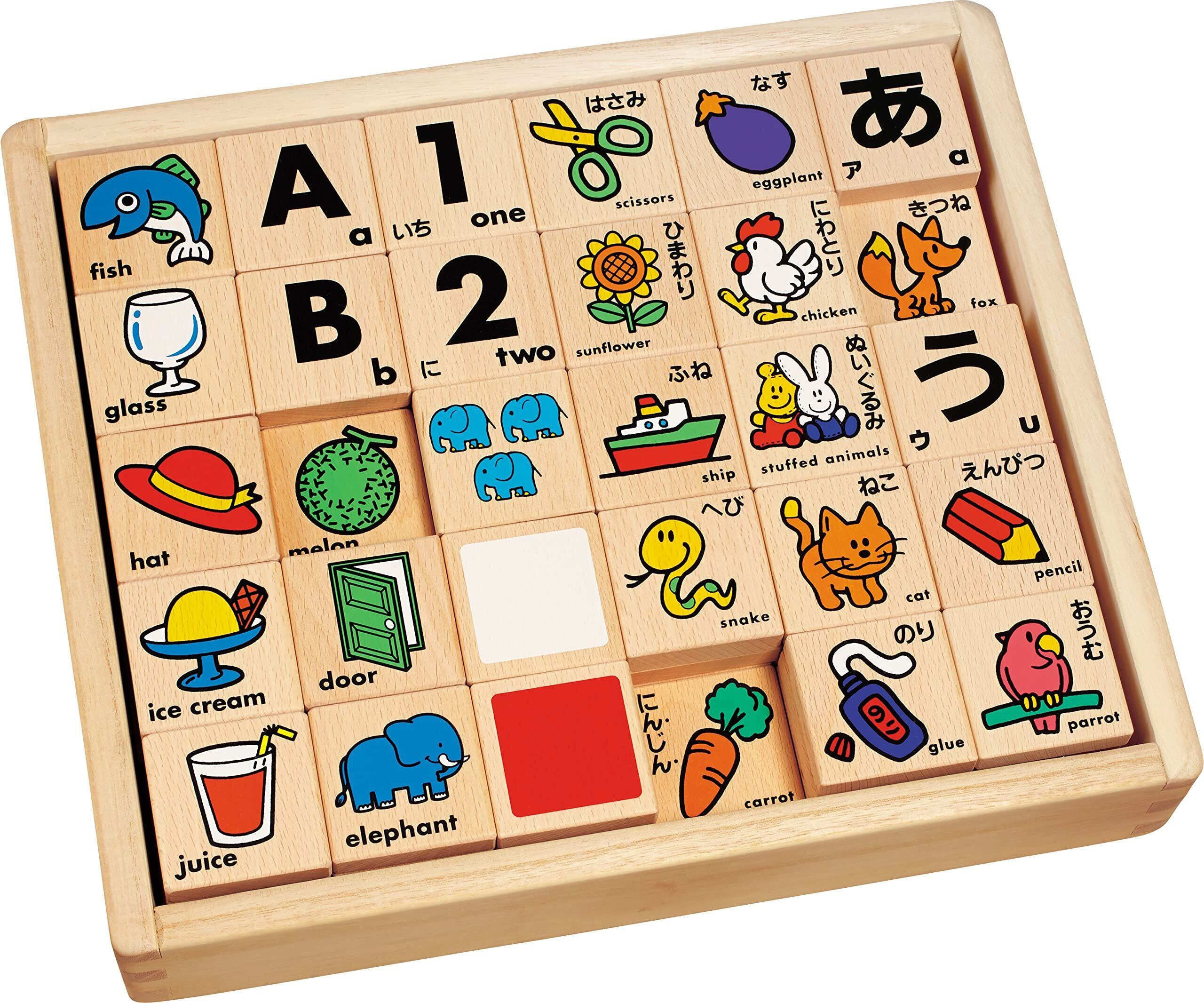 ・ひらがなやアルファベットに興味をもち始めたお子さまが遊びながら覚えるのにぴったりの積み木です。
