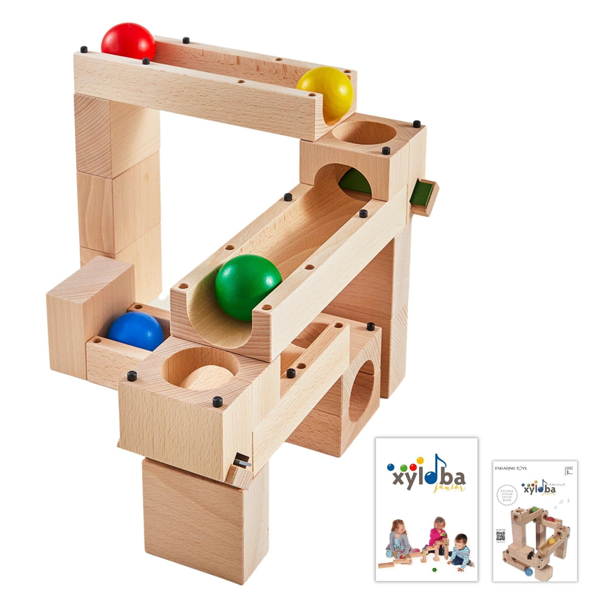 サイロバジュニアは、3歳以上の小さな子どもたちのための「音が鳴る」スイス製マーブルラン。大きなブロックを組み立ててコースを作り、大きいカラフルな大玉を転がしてみましょう!音階プレート付きのブロックを玉が通った時、美しい鉄琴の音色が響きます。 ボールの直径は46mmで喉を通らない大きさのため、誤飲の心配がありません。