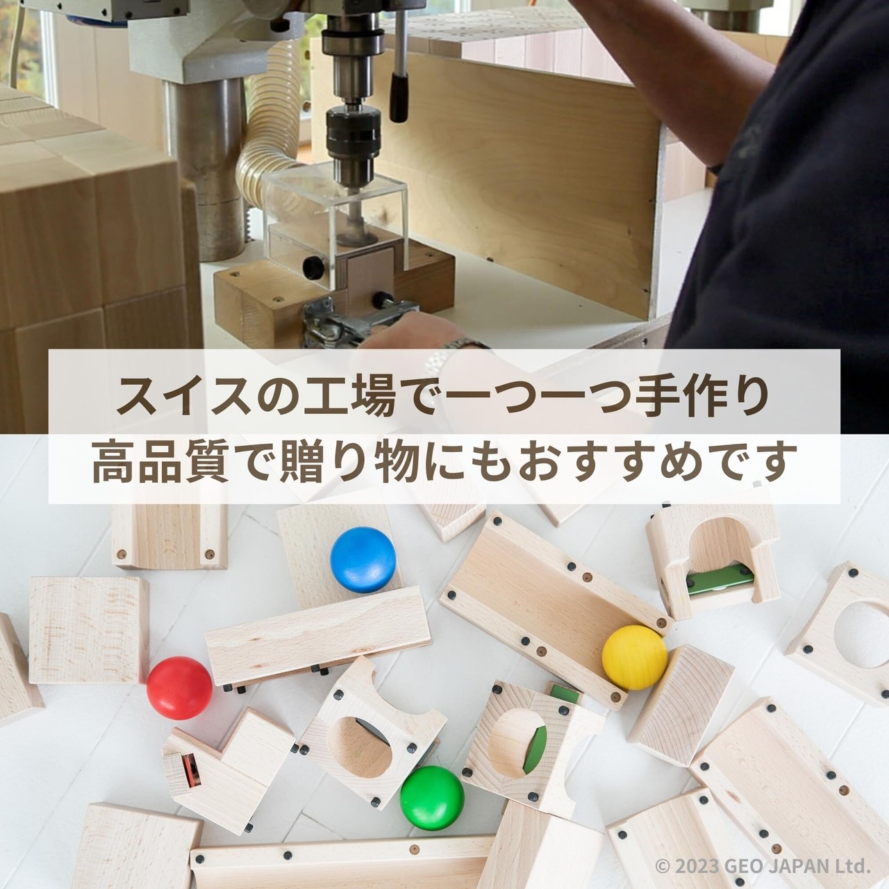 【入数】レール用ブロック(ロング)×3個/レール用ブロック(ショート)×2個/穴付きブロック1個/音階プレート付きブロック「ド」「ソ」各1個/ブロック9個/ボール(赤・青・黄・緑)各1個 【パッケージサイズ】幅48×高さ24×奥行7.5 (cm) 【重量】3.8 kg 【素材】ブロック・レール・ボール: 木製(スイス・ドイツ産ブナ)/音階プレート鉄琴部分: 金属製 【対象年齢】3歳~ 【企画・製造国】スイス