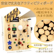 【モンテッソーリ ビジーボード】- この 感覚おもちゃ には 10 種類のスイッチと 19 個の LED ライト セットが付いており、お子様が何時間も楽しく遊べます。木製の ビジーボード モンテッソーリ には 2 本の AAA 電池が必要です (電池はおもちゃセットに含まれていません)。