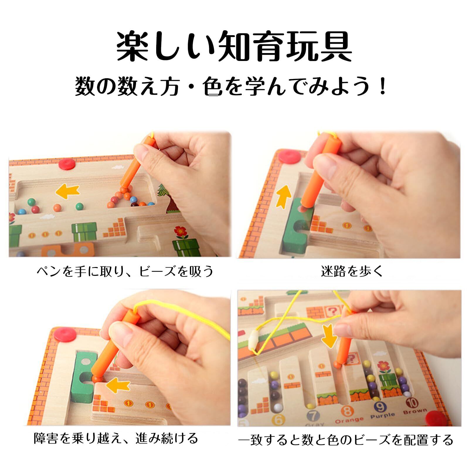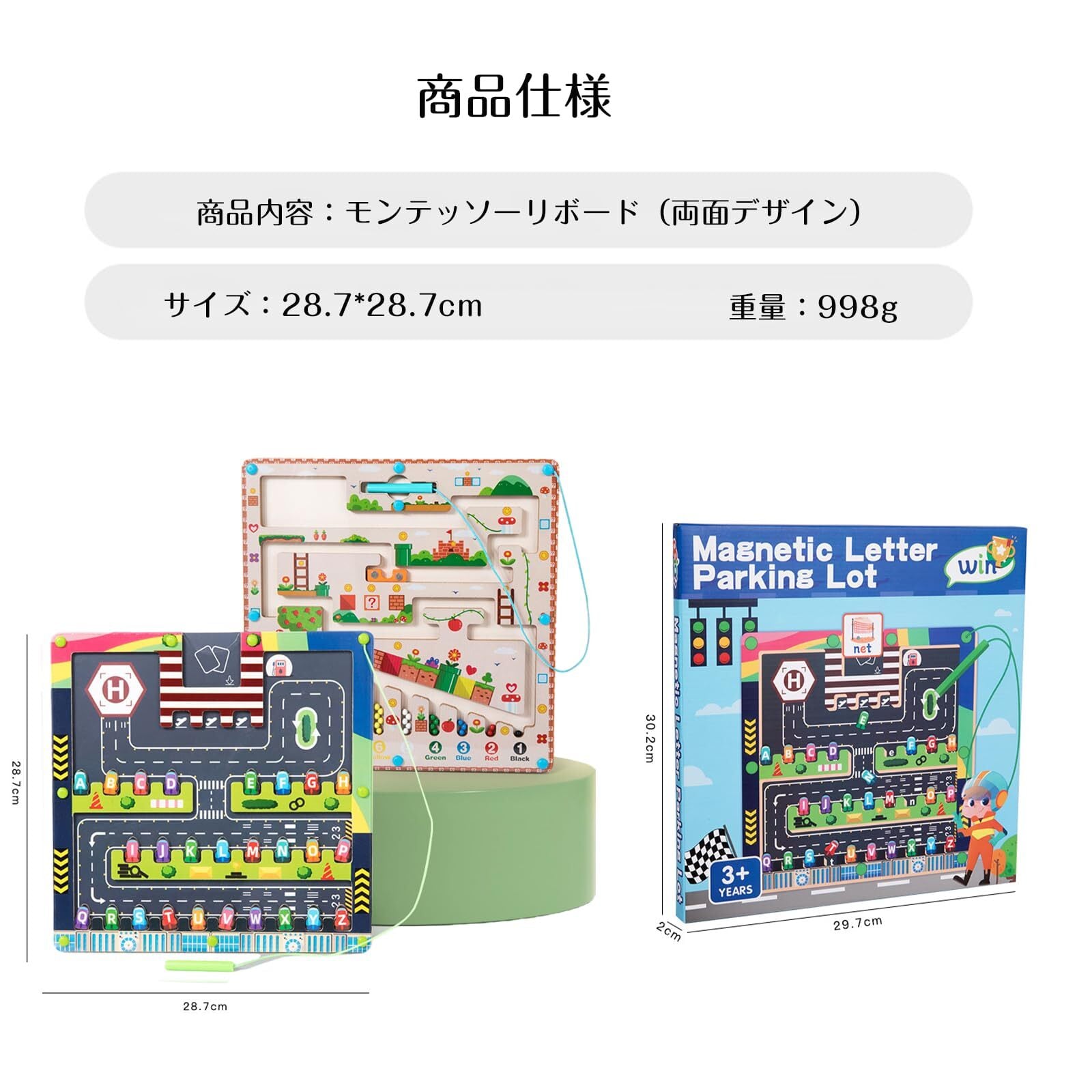 【モンテッソーリの教育】男の子と女の子を問わず、だれでも簡単におえがきを楽しめる子供のおもちゃ。さまざまな遊び方がある迷路ボードのおもちゃは、子供たちが遊びながら学び、想像力、創造性、忍耐力、集中力などの能力を高め、数を数える練習をし、形状と色の認識を高め、手と目の協調を改善し、細かい運動能力を発達させることができます。この知育玩具は子供の興味を引き出して楽しみながらそれらの能力を高めます。 【安全で環境にやさしい】マグネット式迷路ボードは、高品質で環境に優しい天然木で作られています。各ブロックは角が丸く、バリがないように丁寧にサンディングされています。迷路ボードは、赤ちゃんの小さな手に配慮した滑らかな丸みを帯びた角を持ち、閉じた磁性ビーズが効果的に飲み込む危険を回避することができます。電池は不要で、繰り返し使えるので、紙のゴミを減らし、環境にも優しいです。 【集中力のトレーニングに】ペンで磁気ビーズを吸い、移動させ、対応する位置にビーズや車を置くにはかなりの集中力が必要です。冷静に考えながら、ビーズを所定の位置に置くには少し時間がかかりますが、忍耐力を養うには最適です。これは幼児だけではなく、老人の痴呆防止にも役立ちます。 【数・英語・色の認識】知育玩具には、さまざまな形や色のブロックとビーズがあります。赤ちゃんは、モンテッソーリのおもちゃの指示に従って、ビーズやカートを対応する位置に置くことができます。繰り返し遊ぶことで、それぞれの英語単語や色を認識し、熟知していきます。遊びながら、子供の色彩感覚や形の認識、論理思考を育てていきます。 【プレゼントとして最適】様々な遊び方でお子様を夢中にさせ、楽しみながら学ばせることができます。軽量で適度な大きさなので、バッグやカバンに入れたままでも邪魔にならず、子どもたちはリュックに入れて好きな場所に持っていくことができるので、お出かけにも最適です。学習や脳の発達に欠かせない知育玩具として、また、お子様の誕生日や暇つぶし、ストレス解消、子供の日、クリスマスや新年のプレゼントとしても最適です! 【品質】商品は品質が付いており、出荷前には商品を各種検査を行います。万が一ご購入の商品に不良品がございましたら、御遠慮なく本店に連絡してください。ご希望に添えるよう対応させていただきます。