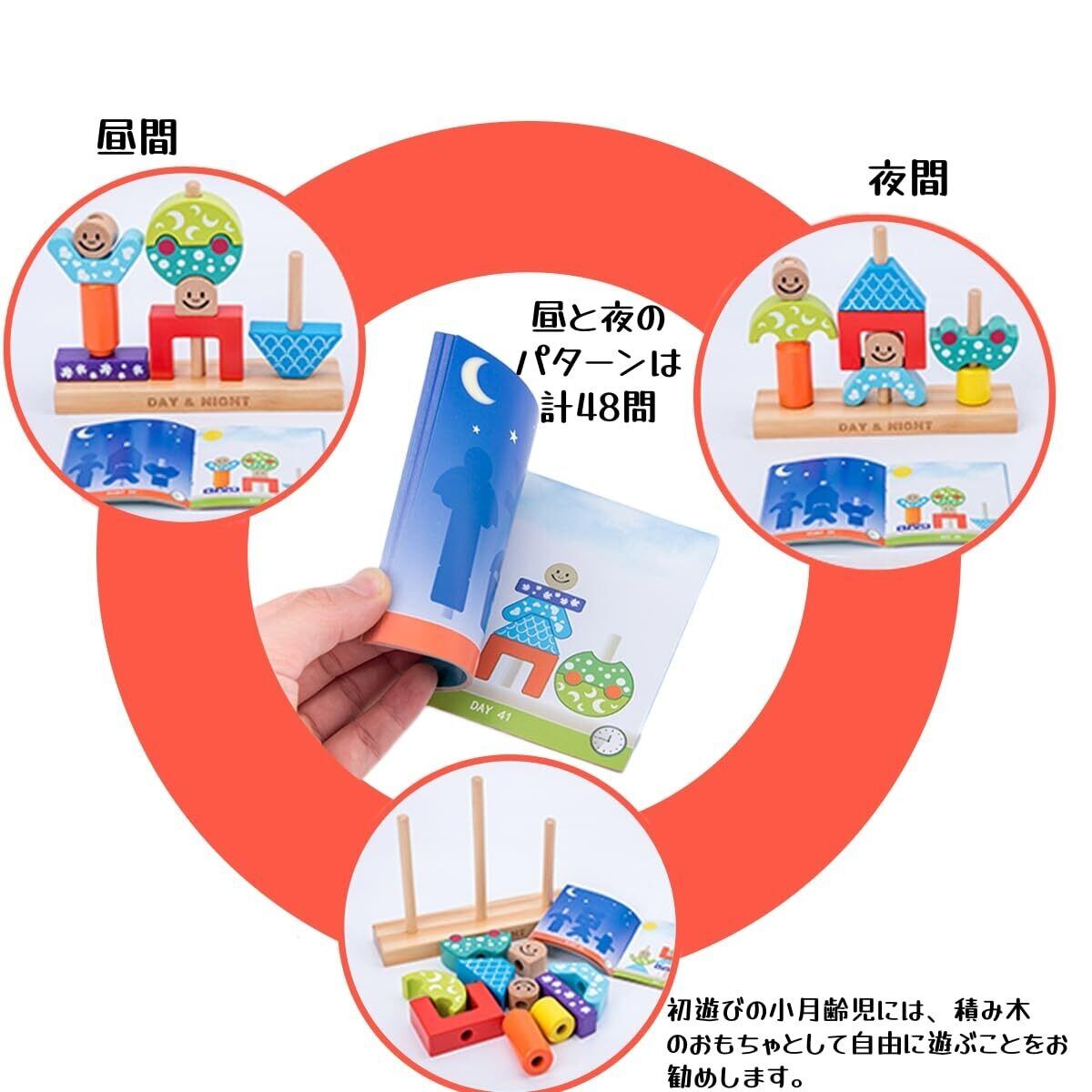 Bajoy モンテッソーリ玩具 知育玩具 積み木 棒通し1 2 3 4歳幼児 指先訓練 形状認知 早期開発 はめこみ 形合わせ 観察力 空間認識など多機能 カラフルな木製おもちゃ 女の子男の子 誕生日 クリスマス プレゼント チャレンジ手帳付き(昼と夜のパターンは計48問)