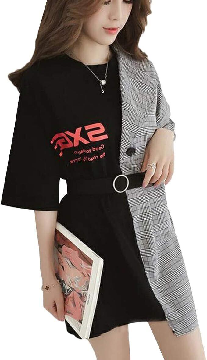 【特価セール】[JPバレンタインデー]レディース チェック柄Tシャツ 夏服 半袖Tシャツ カットソー 切り替トレーナー ワンピース 不規則 アシンメトリー 個性ブラウス ゆったりTシャツ チュニック 学生 通勤 通学 オシャレ 柄プリントTシャツ (ブラック 2XL) | BOSSO
