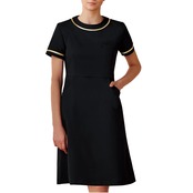 首元や袖口にサテンテープを施したシンプルなデザインのワンピースチュニックです。
