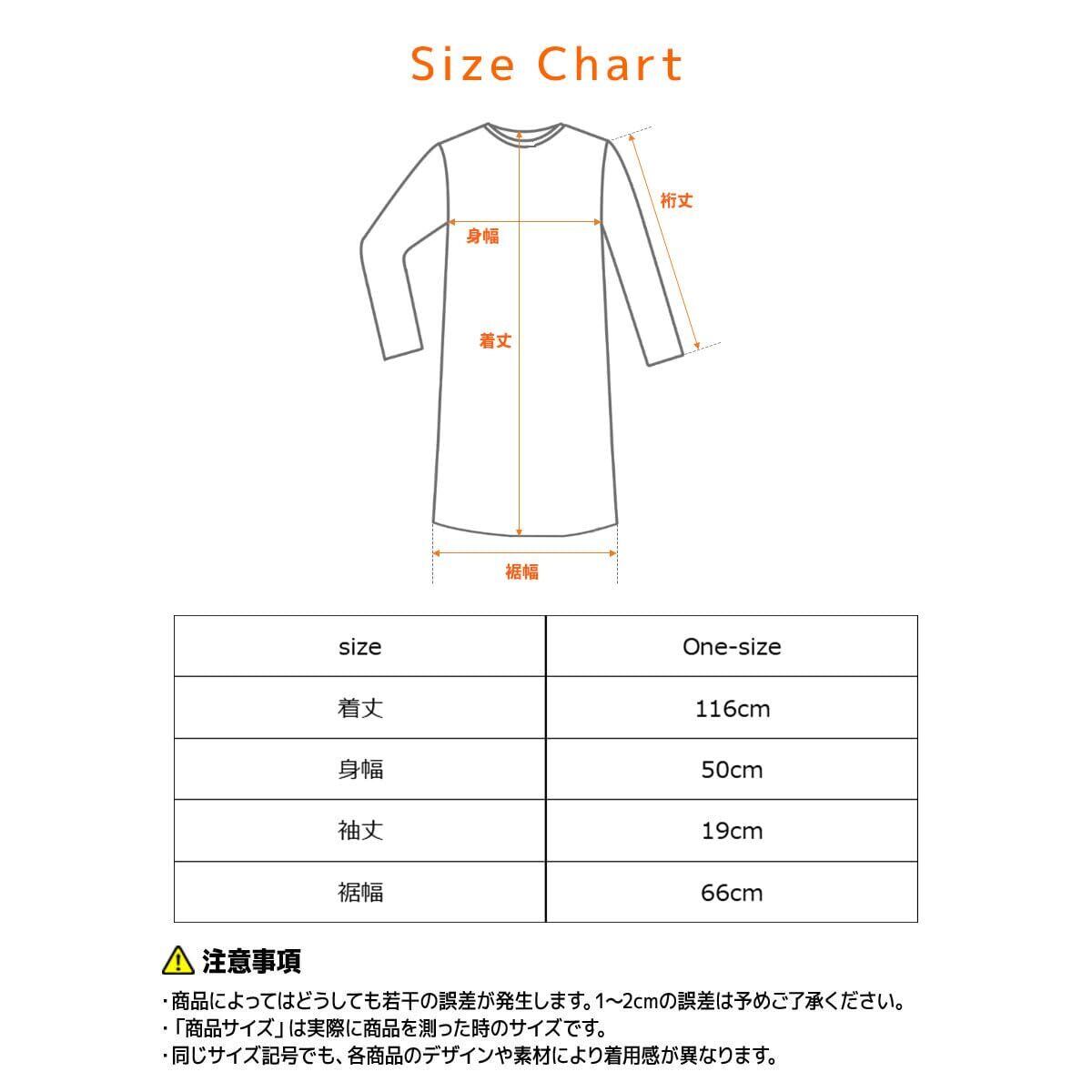 身長154-169cm、胸囲74-99cm、着丈116cm、身幅(半身)50cm、裾口(半身)66cm、袖丈18.5cm
