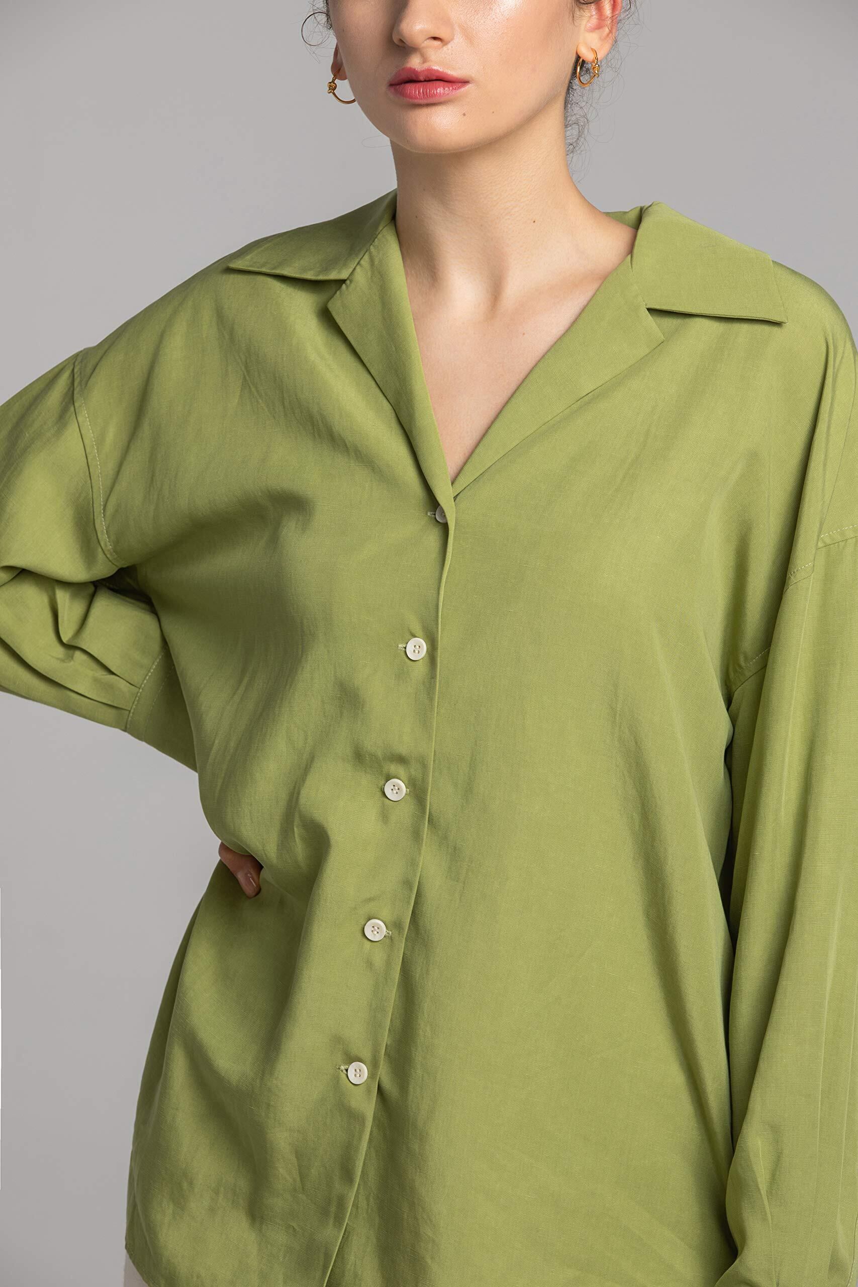 程よいスキッパーの開きが大人っぽい印象のシャツ。なめらか高品質なテンセル素材を使用、ソフトな風合いで光沢感があり、最高の着心地を叶える。流れるようなドレープ感のあるシルエットを実現させました。対照的なロマンチックなプリーツスカートと組み合わせても、クラシックなジーンズと合わせても使えるシャツ。