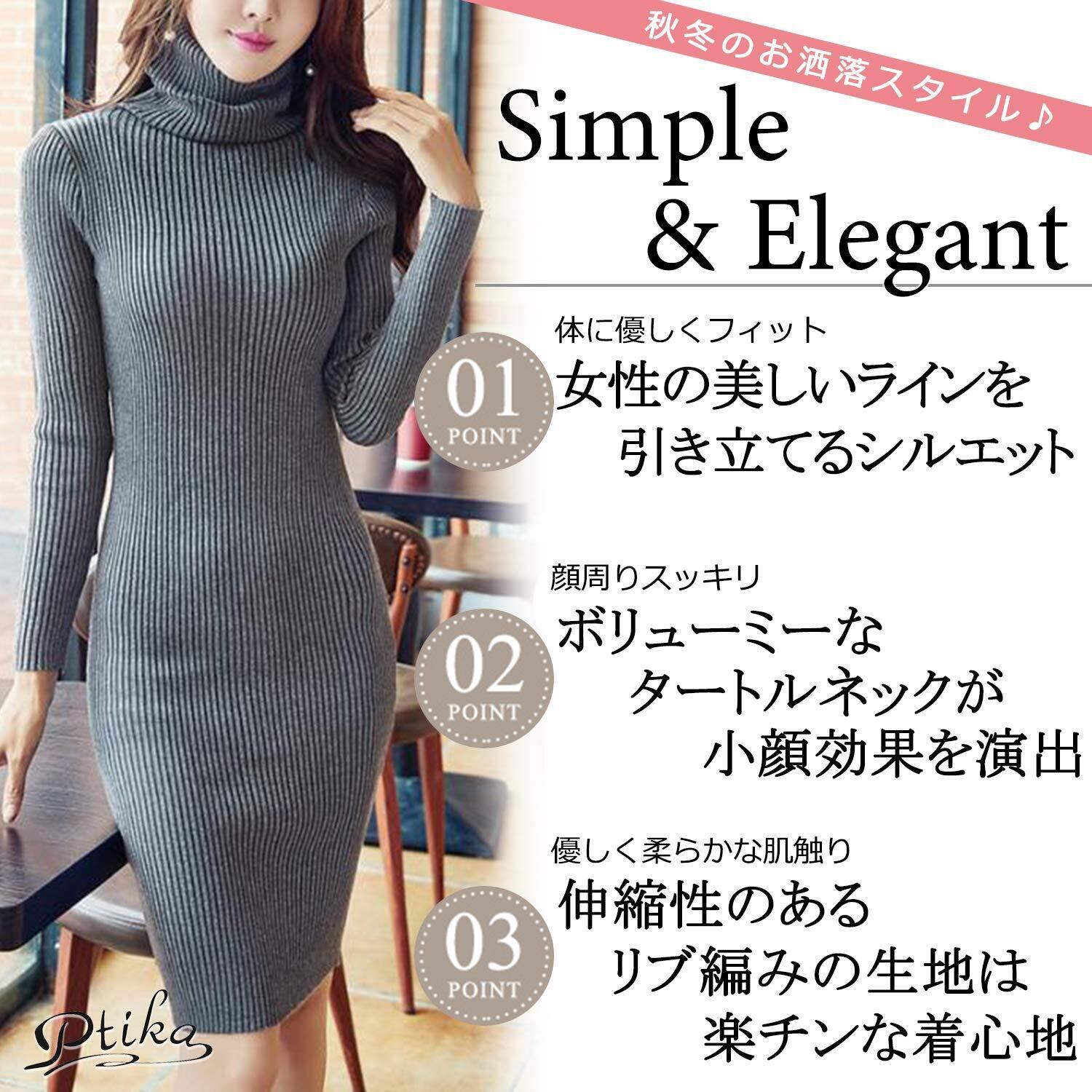 [Ptika] ニット ワンピース レディース 秋冬 タートルネック タイト 長袖 アクサセリー 付き