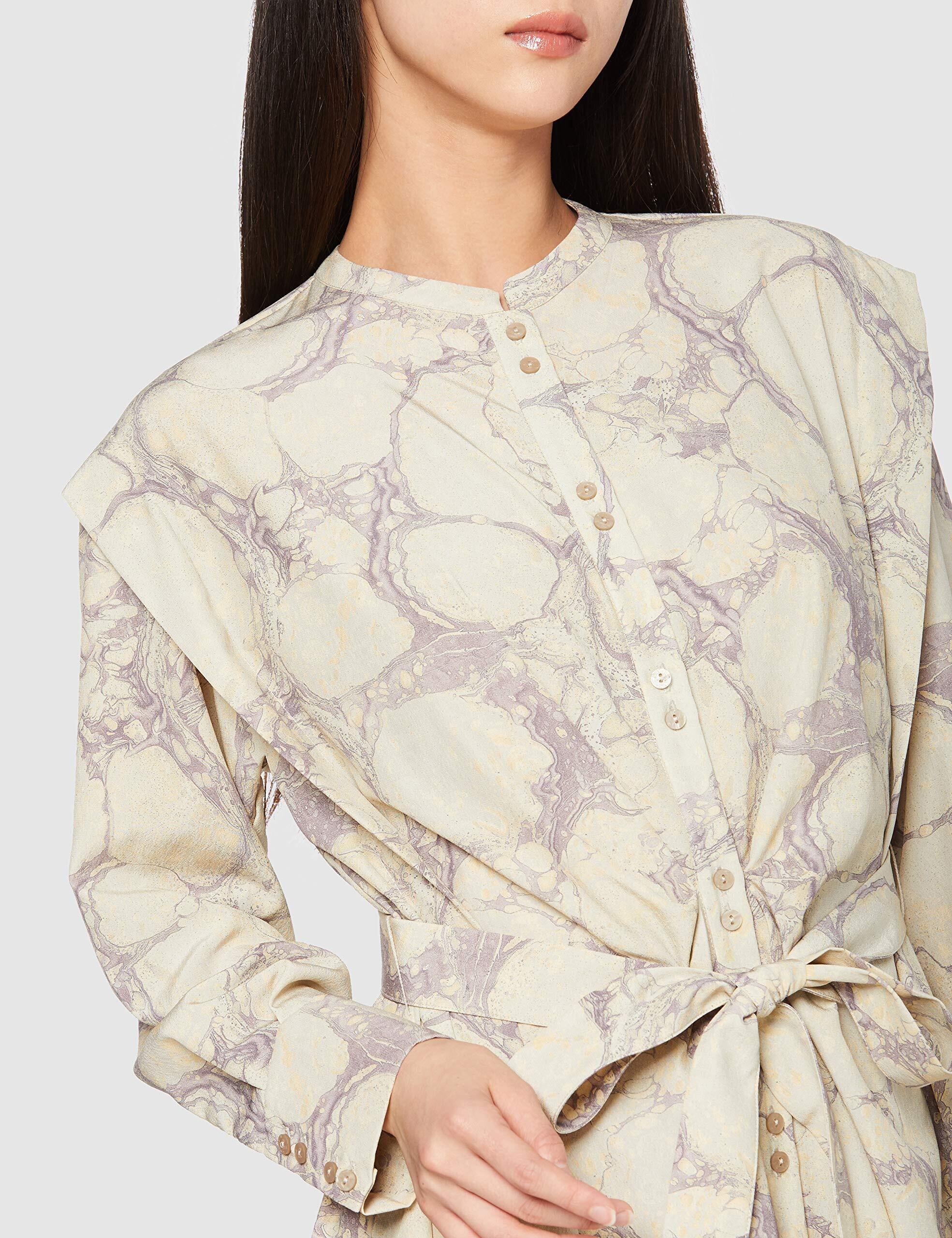 前後とショルダーにタックディテールをあしらい着こなしにモードな印象をプラスするデザインです。 前立てのダブルボタンをポイントに、共布のベルトでウエストマークをするスタイル、そのままストレートシルエットにもアレンジ可能です。 ワンピースとしてだけでなく、前を開けて羽織としても着られるデザインなのでコーディネートの幅が広がります。※インナーキャミワンピース付きです。マーブル柄のグレー、ベージュ、無地のホワイト、ピンクの4色展開です。