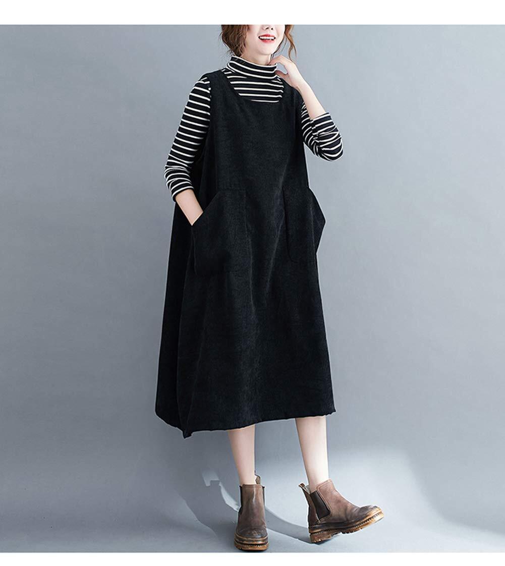 [Ksila] ワンピース レディース 秋冬 コーデュロイ サロペット スカート オーバーオール ジャンパースカート ロング丈 体型カバー 無地 オールインワン 大きいサイズ(M黒)