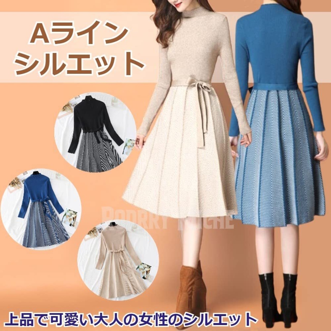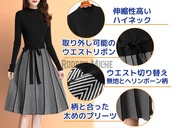 上品な大人の女性を演出してくれる大活躍間違いなしのニットワンピースです。共生地のリボンベルト付きの ウエスト切り替えデザインでスタイルアップ効果もあります。