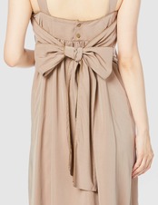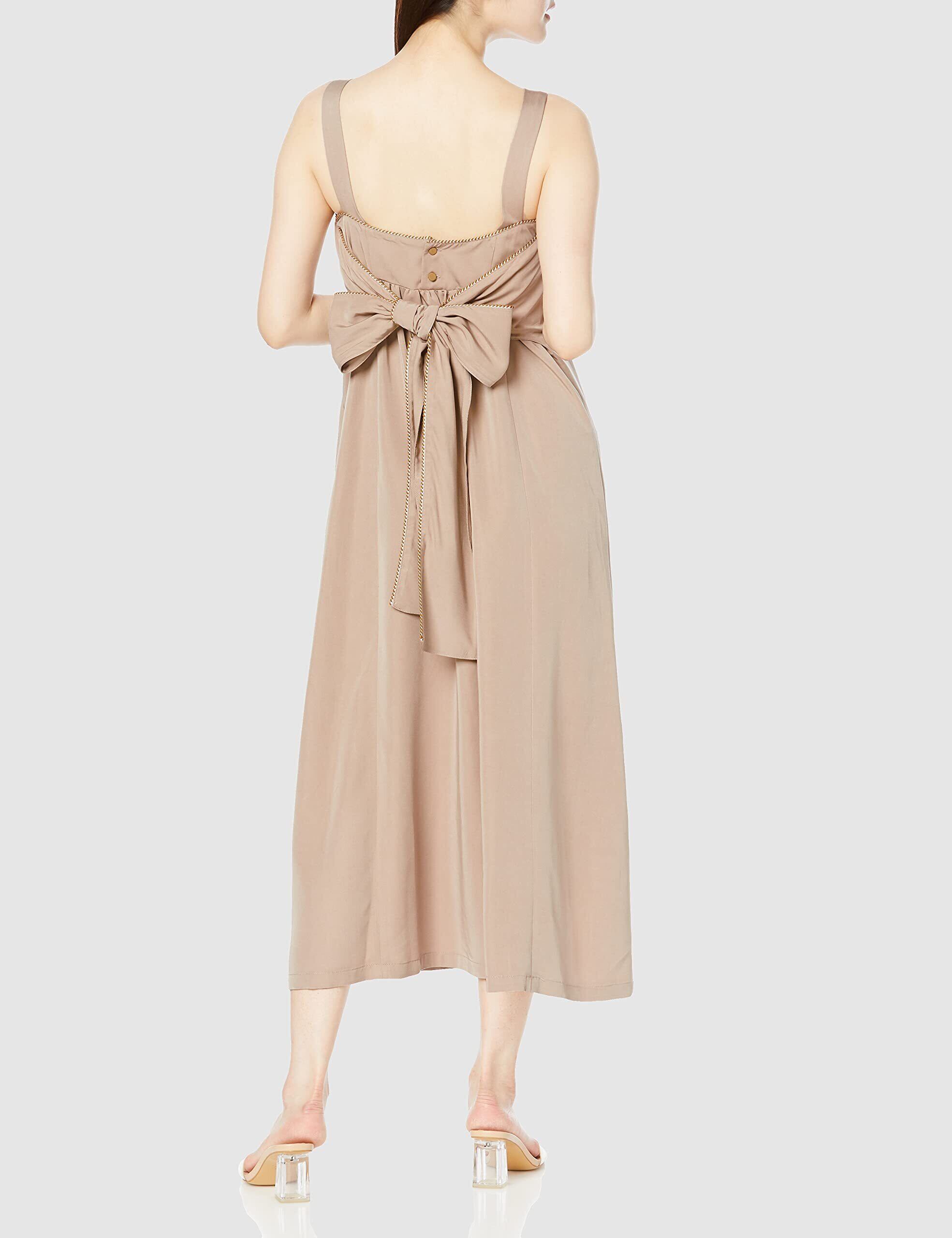 前はシンプル、後ろは背中見せ&長めのリボンを付けたバックシャンワンピースで、ワンランク上のおしゃれを。リボンは前で結んでもOK。襟ぐりやバックスタイルにプラスした表情のあるパイピングも、さりげない華やかさを加えます。甘さがトゥーマッチにならないように、ミニマルなシルエットでリラクシーに仕上げました。ぺたんこサンダルをなどを合わせてラフに着こなすと洗練されたカジュアルスタイルに。