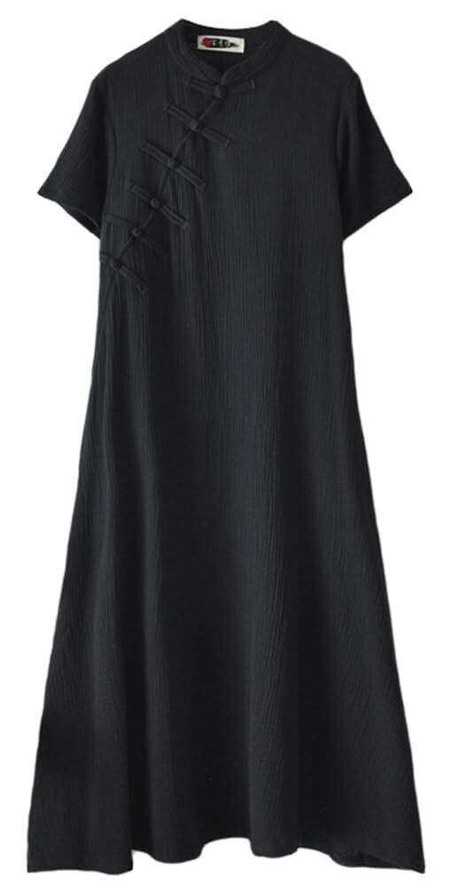 【在庫セール】[ZHENGTU] チャイナドレス ワンピース ドレス レディース 半袖 Aライン マキシドレス 体型カバー 無地 立ち襟 春夏 綿とリネン 快適 涼しい 春夏 ホームウエア | BOSSO