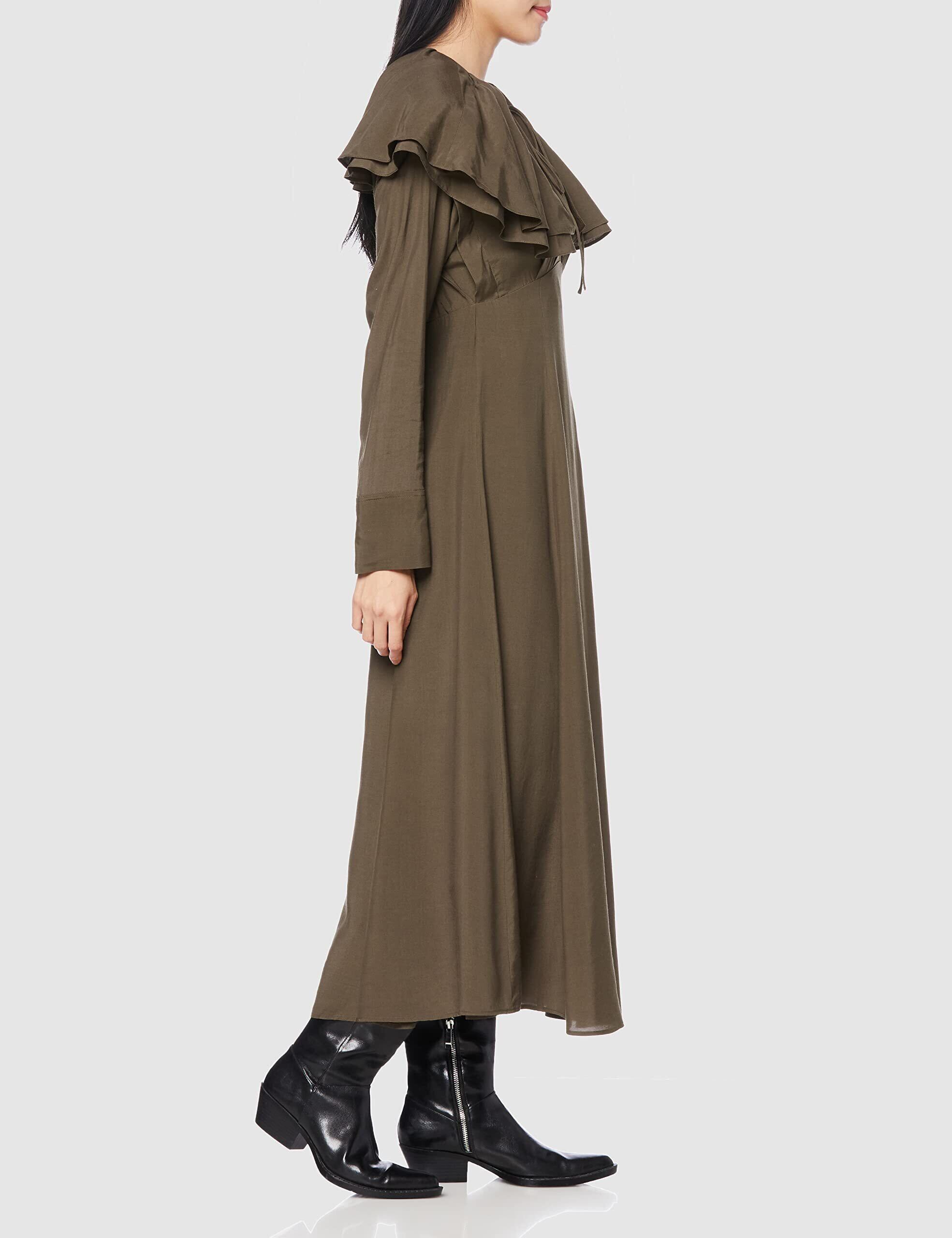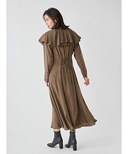 トレンドのビッグカラーが印象的なナローフレアシルエットのワンピースです。 シーンに合わせてつけ襟を取り外すと表情を変えて着用いただけます。 上品な光沢のある素材で仕立てた無地のカーキとブラックに加えて、ホワイトは、アニマル柄をイメージさせる動きのあるドット柄で華やかな印象をプラスしました。