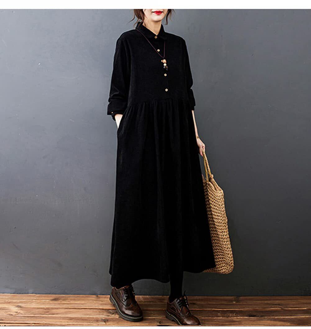 【在庫セール】[YYQ-SHOP]ワンピース レディース コーデュロイ シャツワンピース ゆったり 長袖 ロングワンピース マキシ丈 春 秋 冬 大きいサイズ Aライン 体型カバー 無地 ポケット付き(6ブラック) | BOSSO