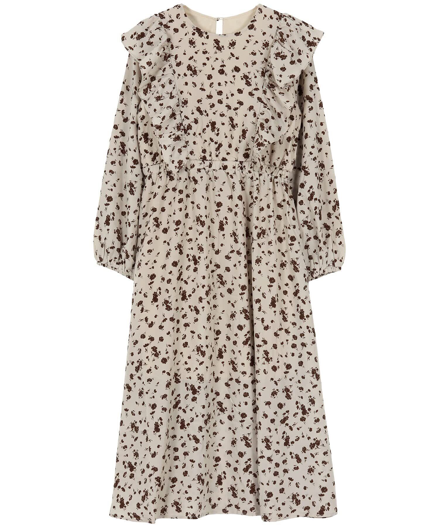 フェミニンな華やかさが溢れるプリントワンピースの登場。ショルダー周りにあしらった立体的なフリルディテールがポイントになっています。秋冬ムード高まるシックなフラワー柄でニットアイテムとも相性がよいので、カーデやベストを合わせるスタイリングもおススメ◎