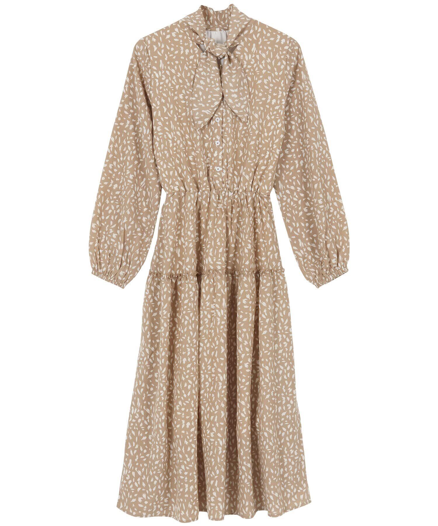 スタンドカラー、ボウタイと気分次第で異なった襟のデザインを楽しめるワンピース。一枚着はもちろん、ニットなどをレイヤードして襟元のデザインを見せた着こなしもオススメです。総柄でありながらも、落ち着きのあるシンプルな配色でシックな印象に◎。大人も着やすいアイテムです。