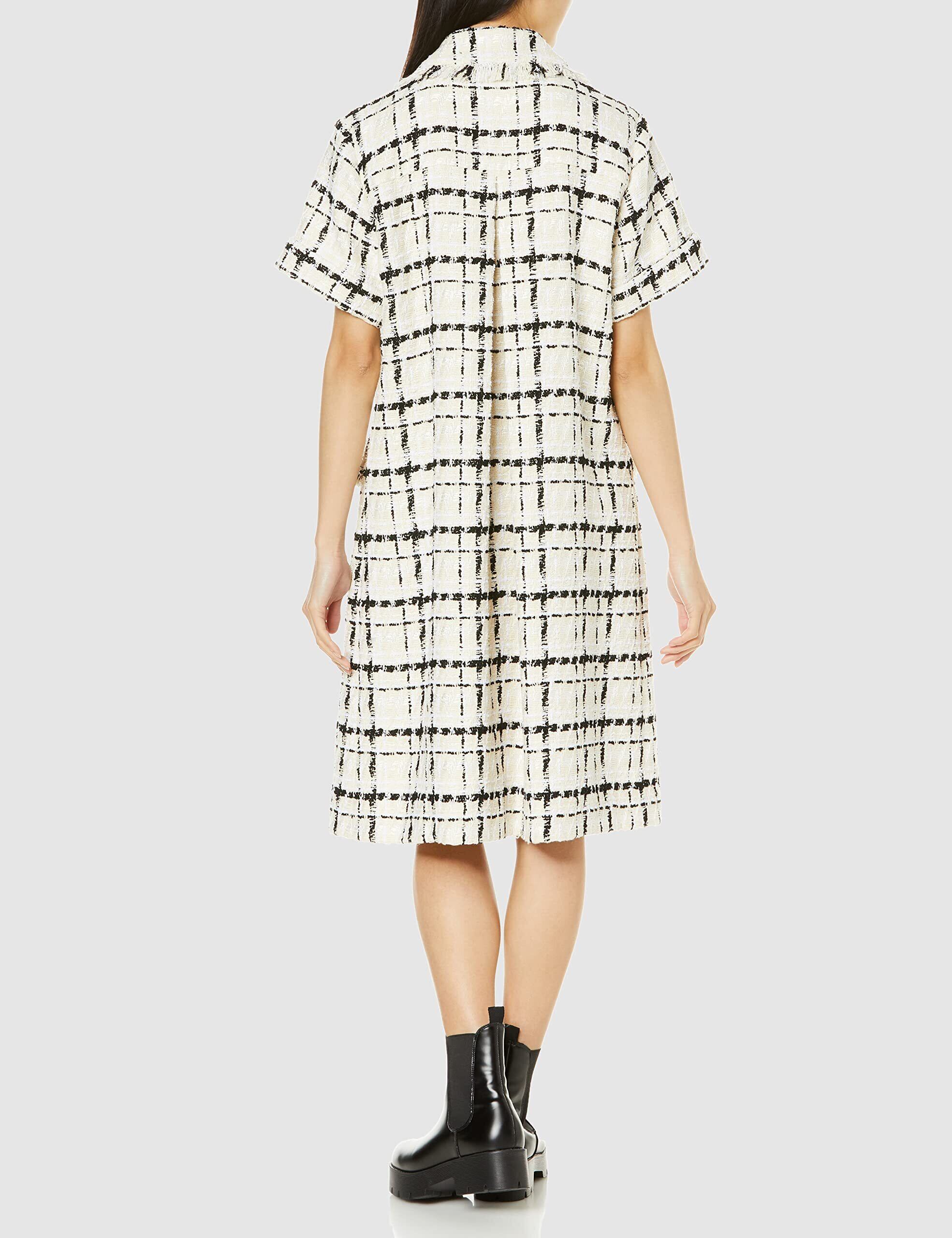 着丈97㎝ フランスのJules Tournier(ジュール トルニエ)社のバイカラーチェックツイード地のコートドレス。フロントを開けてパンツとインナーをレイヤードしてコートスタイリングで着用したり、1枚でドレスとしても着用可能なデザイン。