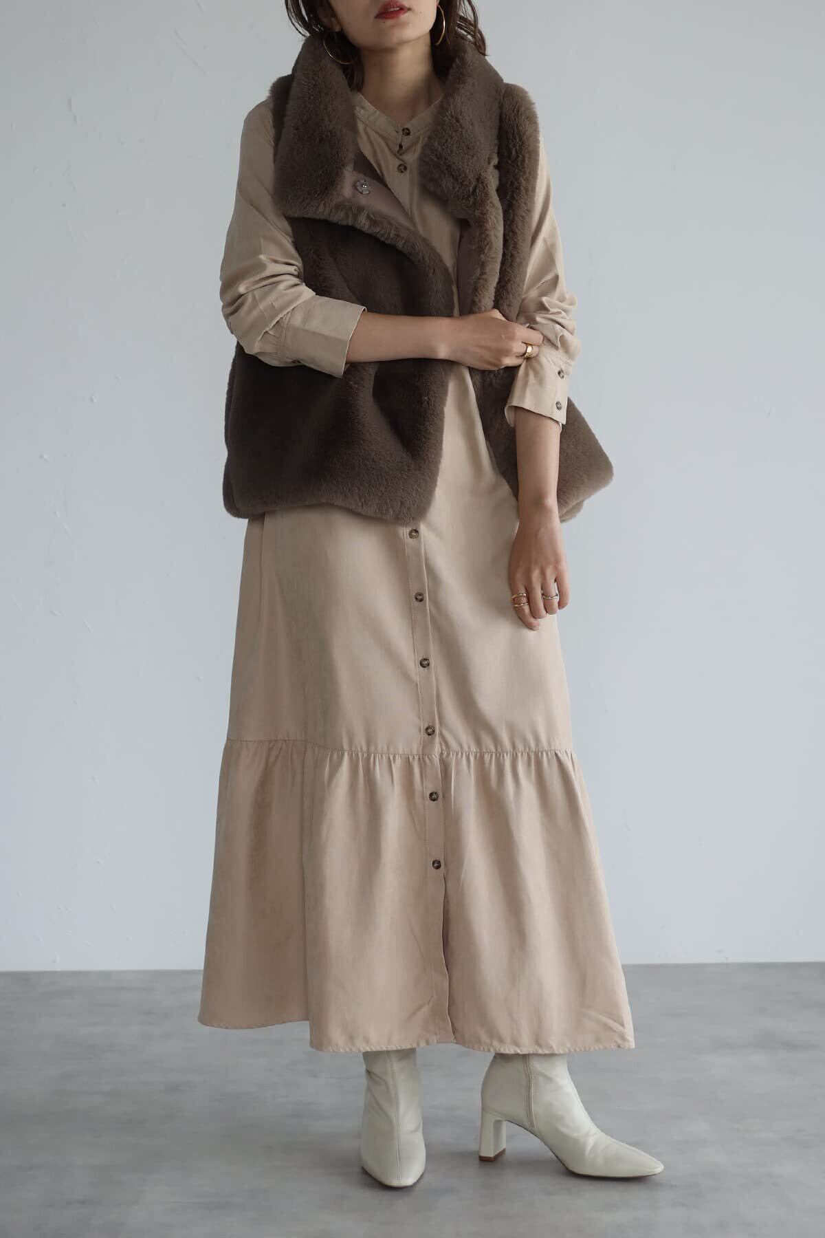 スウェード調の生地で、秋冬らしい温もり感のあるワンピース。