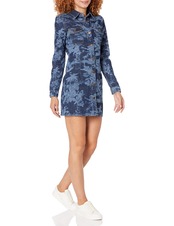 このミニ丈のスリムデニムシャツワンピースはフロントボタンデザインで、トロピカルモチーフのレーザープリントをあしらいました。コットン素材仕立て。
