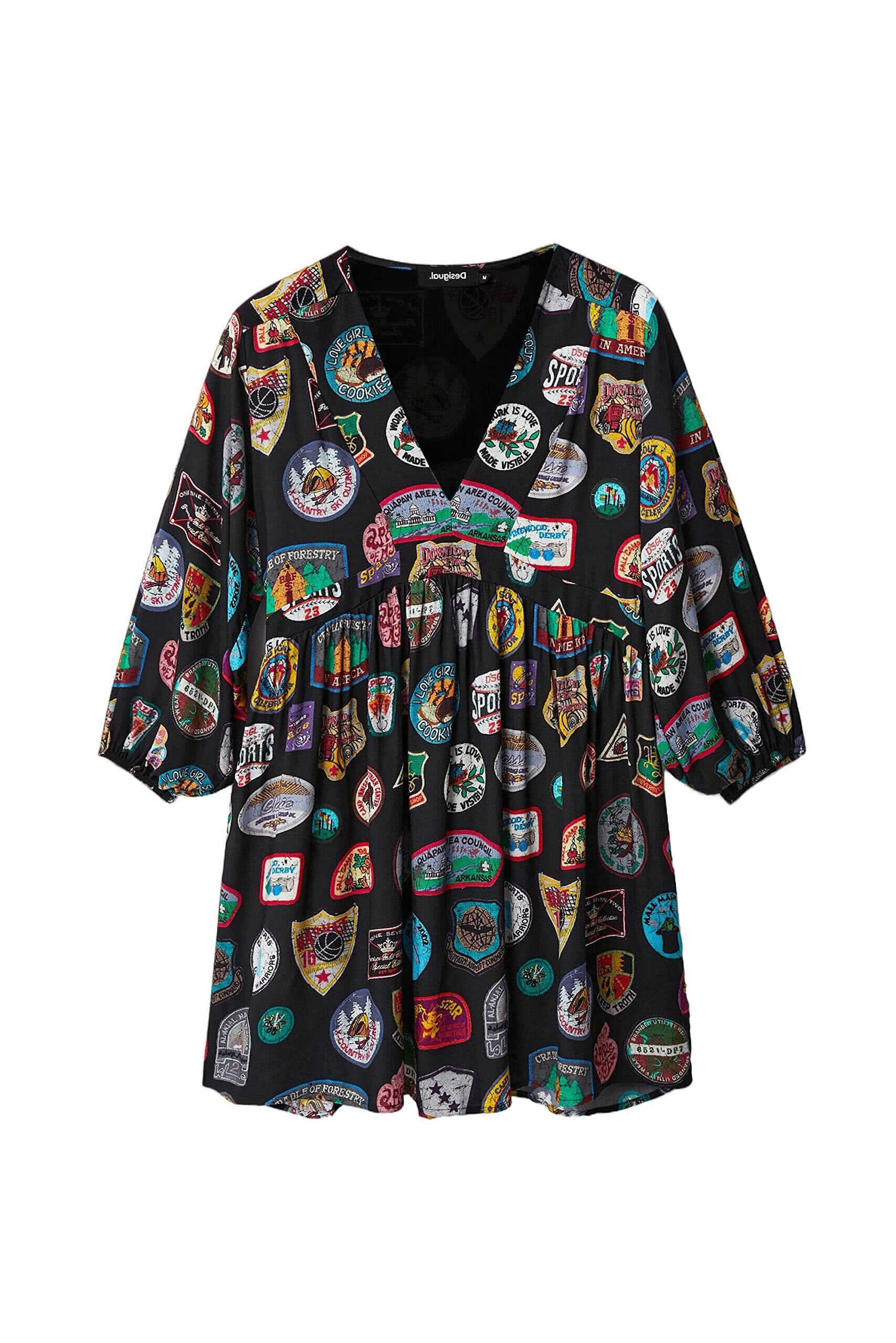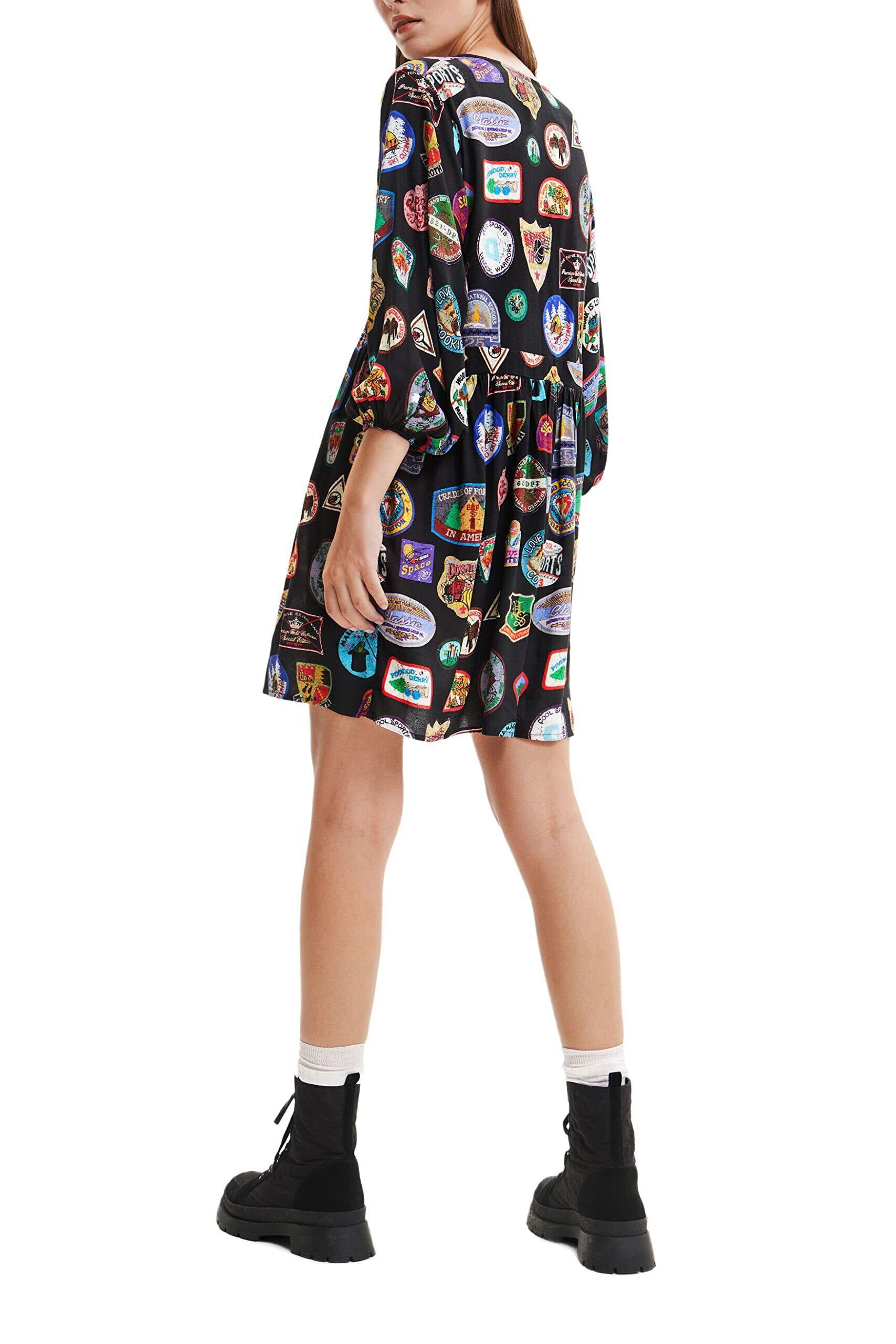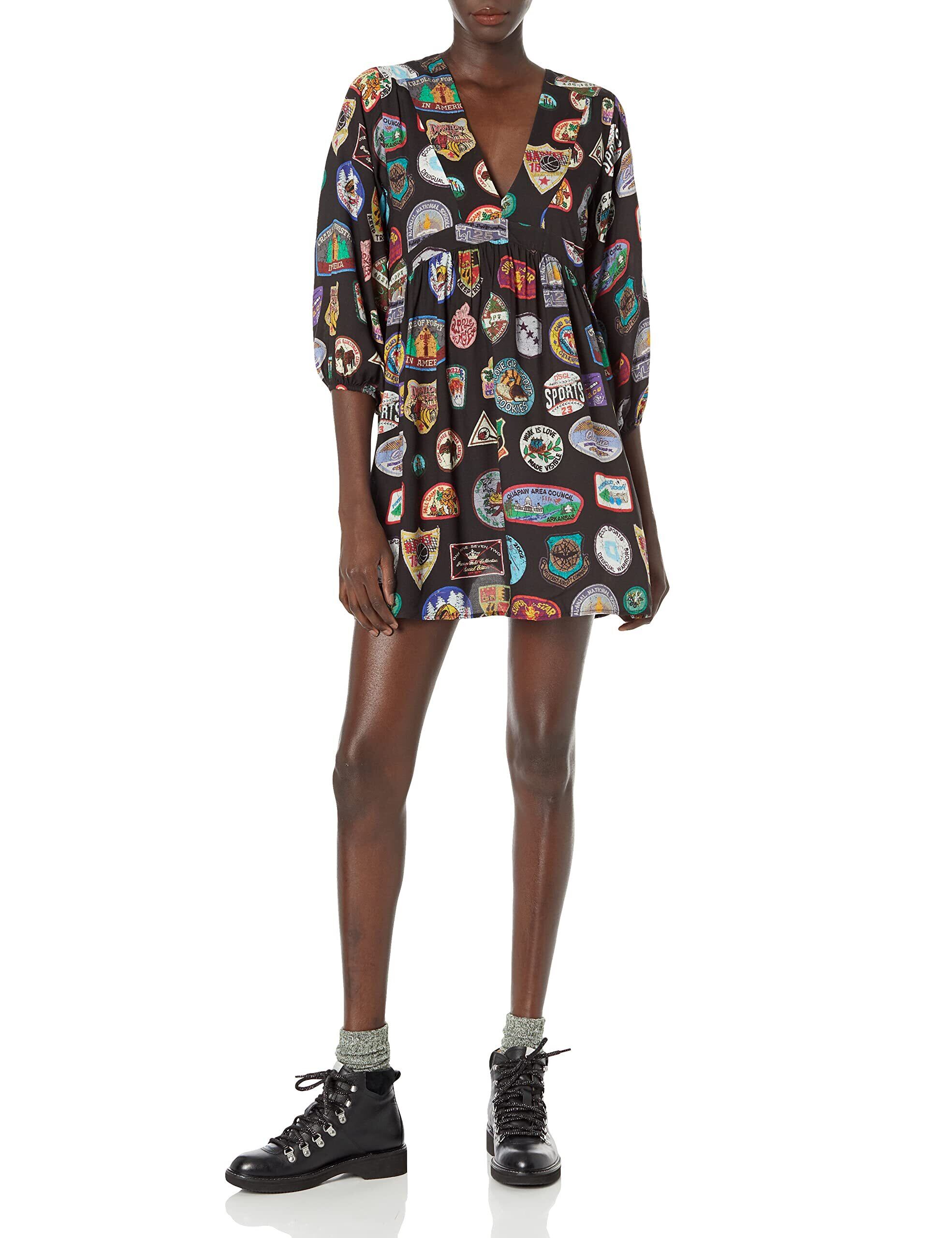 このAラインショートワンピースはコットン素材仕立てで、パフスリーブと全体にカレッジスタイルのパッチをモチーフにしたデジタルプリントをあしらいました。