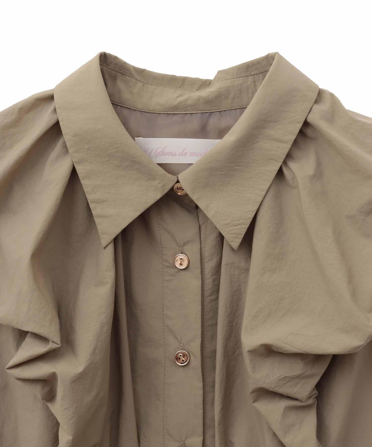 軽いワッシャーナイロン素材のシャツ襟デザインのワンピース。肩周りにボリュームのある袖とつながったバルーンフリルのシルエットが可愛い、一枚でコーデが決まるワンピース。小さめなゴールドの釦がアクセントになっています。 ※52カラー:ペチコート付き