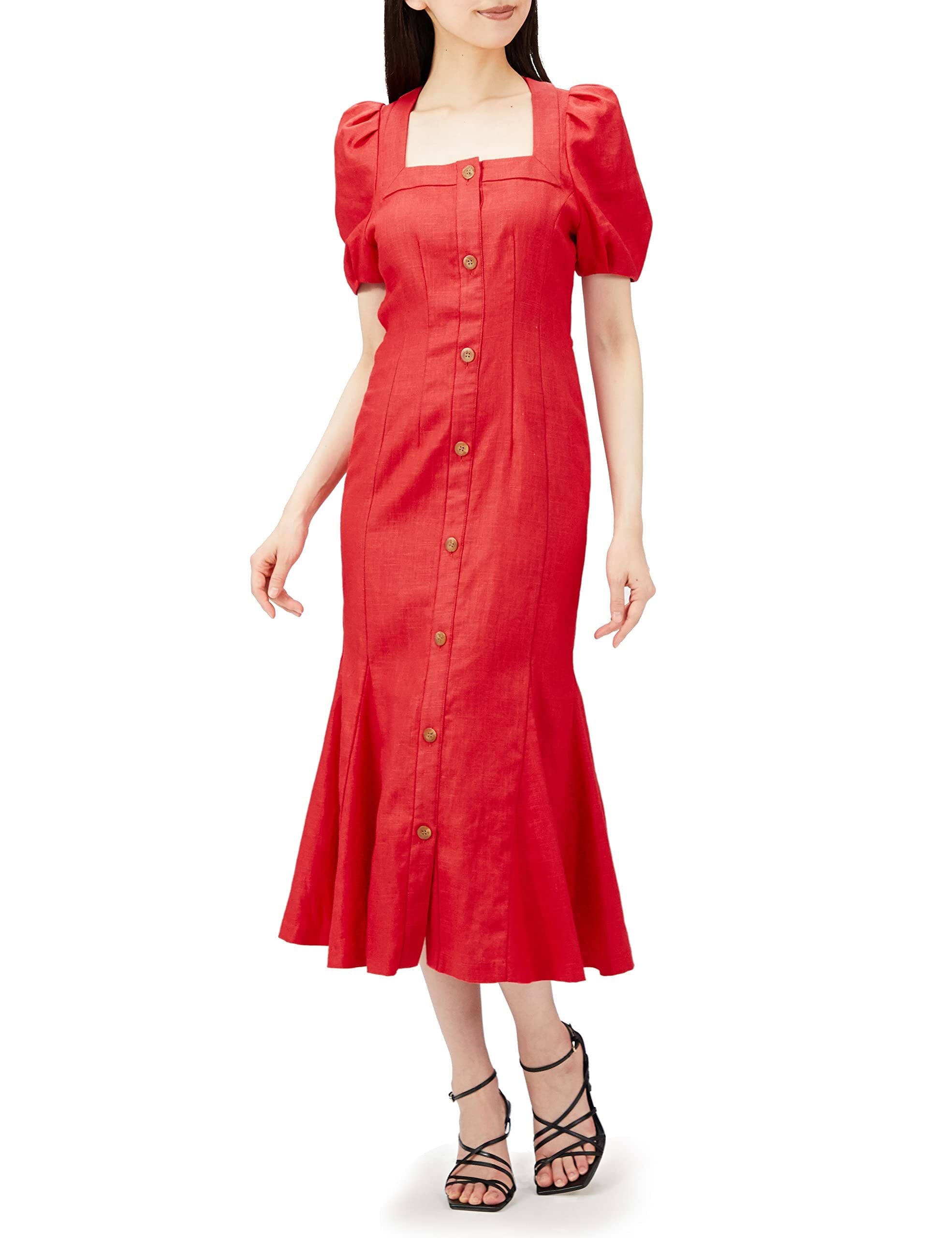 アイテム説明 【ナチュラルなリネン混素材が夏ムードを高めるマーメイドワンピース】 【Design/Styling】 デコルテ見せのスクエアネックやふっくらとしたボリュームスリーブがポイントになった、レディムード溢れるワンピース。パネル切り替えが施されたエレガントで美しいマーメイドシルエット。縦のラインを強調するフロントボタンも相まって、スタイルアップ効果を存分に期待できます。1枚で着てもサマになる万能ワンピースはデイリーコーデの強い味方です。 【Fabric】 夏らしいリネン混の素材を使用しました。発色の良いレッド、女性らしい雰囲気のモカ、品の良さを感じさせるネイビーの3色展開です。 ※照明の関係により、実際よりも色味が違って見える場合があります。 またパソコン・スマートフォンなどの環境により、若干製品と画像のカラーが異なる場合もございます。予めご了承ください。 商品の色味は、商品単品画像をご参照下さい。 ※商品画像はサンプルのため、色味やサイズ等の仕様に変更がある場合がございますので、予めご了承ください。 【サイズ備考】 [0]【インナー】総丈102cm、バスト82cm、ウエスト91cm、ヒップ102cm、 [1]【インナー】総丈105cm、バスト86cm、ウエスト95cm、ヒップ106cm アイテム詳細 素材 ワンピース:ラミー80%、綿20%/インナー:ポリエステル100% 原産国 中国