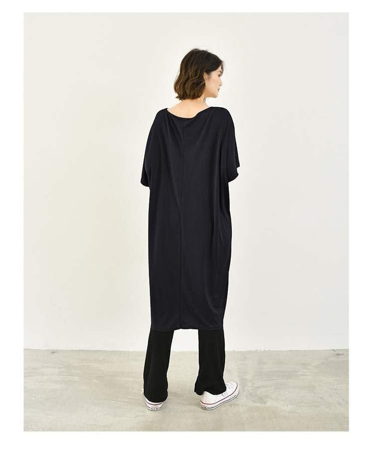 【楽ちんワンピース】一枚でさらりと着られるロングワンピース。ドルマンスリーブ デザイン、着痩せ効果抜群。体を自由に伸ばせ、締付感もありません。表面はきめ細かい質感で、滑らかな手触りです。ゆったりとしたシルエットで、普段着、ご近所着、散歩や買い物、部屋着として。