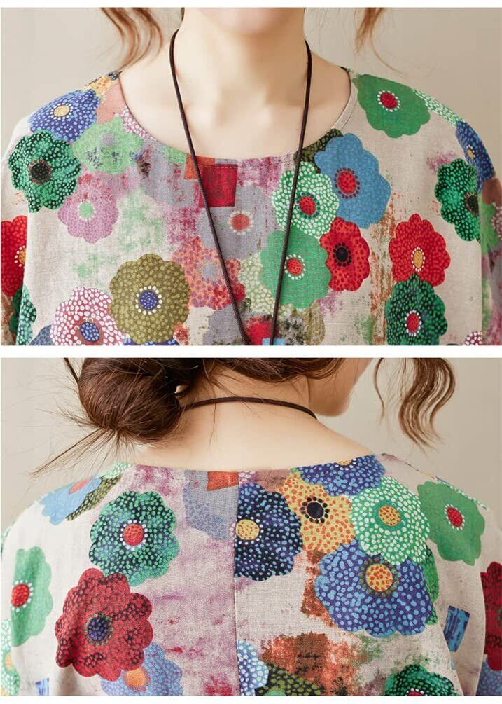 【2022最新】[ZHENGTU] ワンピース 花柄 レディース 綿麻 夏 ドレス クルーネック 体型カバー 半袖 ひざ丈 フラワー 可愛い 大きいサイズ 柔らかい 普段着 カジュアル ゆったり エレガント フリーサイズ | BOSSO