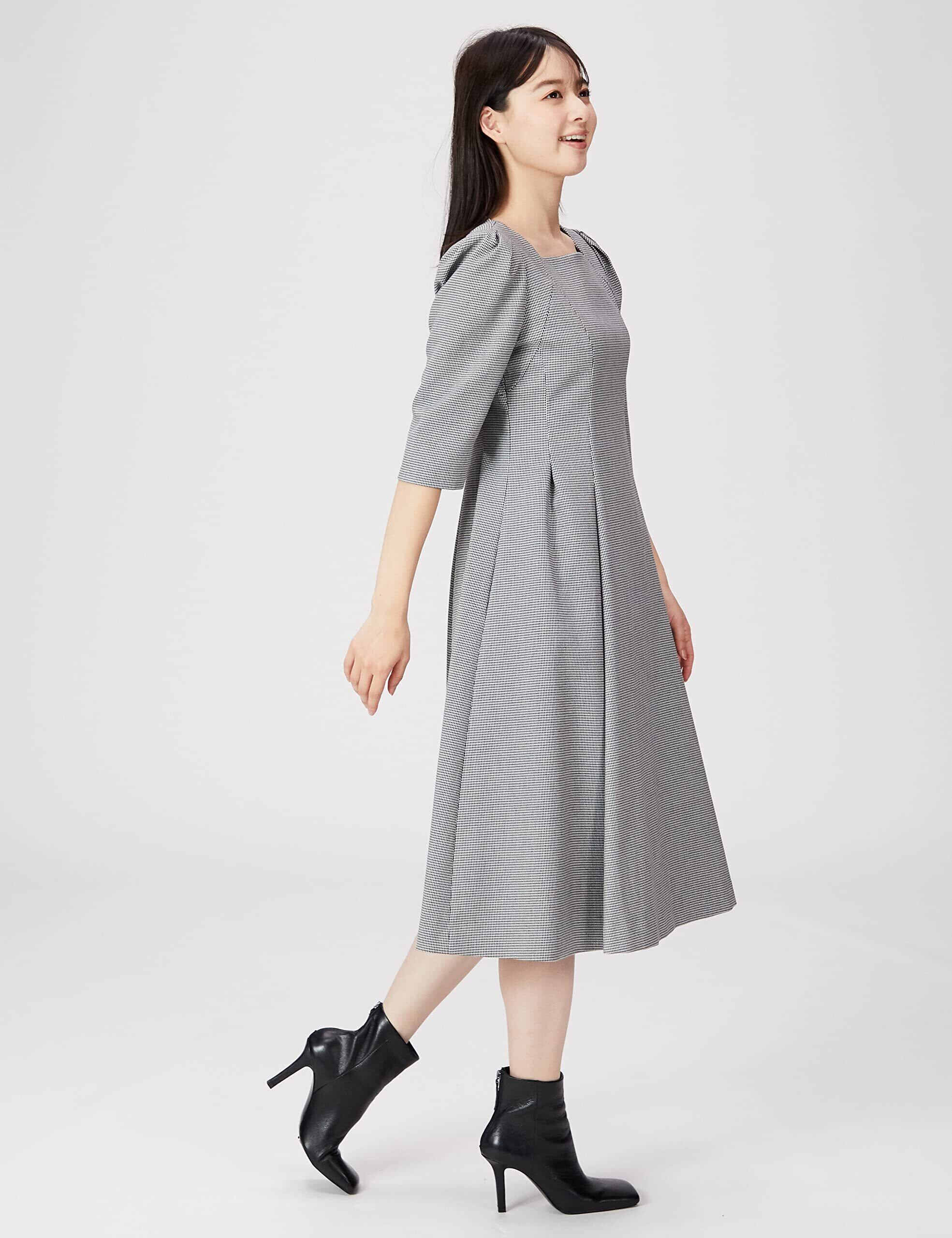 横ハリのあるトリプルクロスの素材を使用したワンピース。 衿ぐりはデザインを少し入れたスクエアネックにし、デコルテをすっきりと美しく見せてくれるようなカットにしました。 身頃は縦のパネル切替にし、縦ラインを強調しながらもパネル切替から広がるタックで、綺麗なフィット&フレアのシルエットに仕上げました。 着心地はタイトすぎず、程良く身体に沿うサイズ感で、身体のラインを綺麗に見せてくれます。 お袖はひじ上のハーフスリーブにし、袖山にタックを入れて縦にボリュームが出るようにしています。 ギャザーではなく、タックにしているので、程よくボリュームが出て、甘くならないデザインにしました。 裏地付き。 両脇に便利なポケット付き。