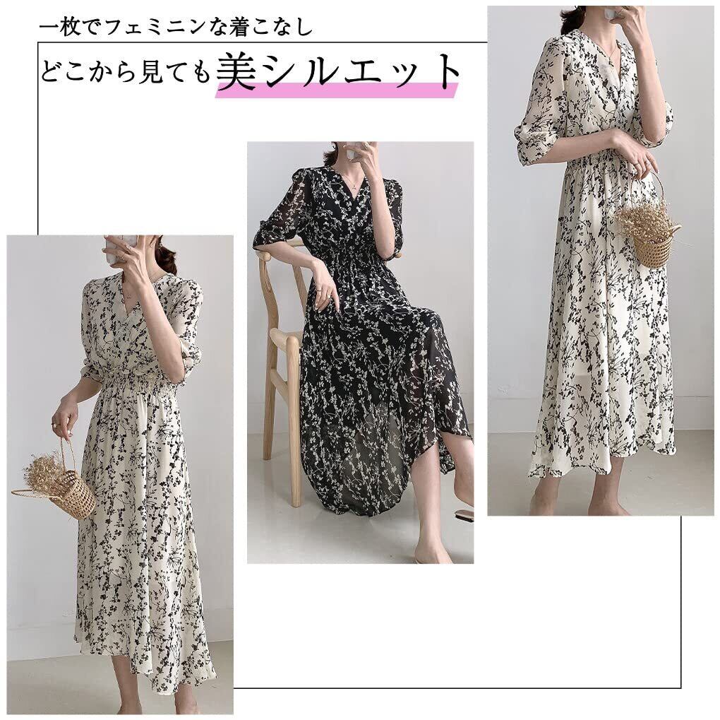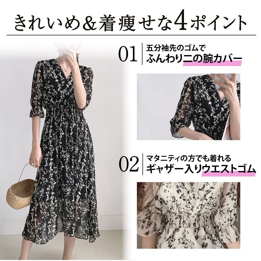 薄手の軽やかで上品なシフォンワンピースです。花柄にVネックが映えるきれいめなデザイン、そしてシンプルな黒と白のカラーがとても合わせやすく、1枚あれば重宝すること間違いなしです。
