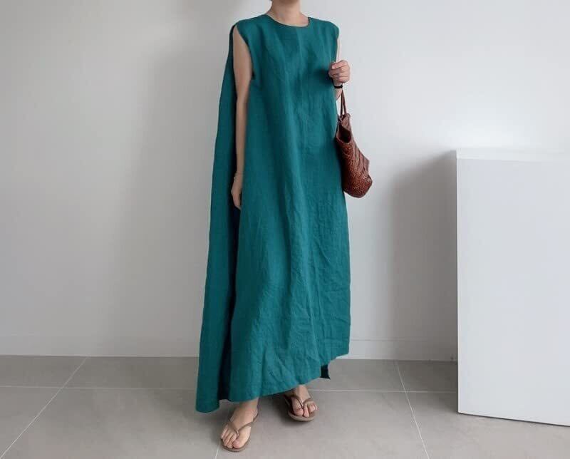 [ロプクス] マキシ ノースリーブ 無地ワンピース ワンピース ロング ゆったり夏 リネンワンピース 無地 体型カバー ロング マキシワンピース 春夏ワンピース カジュアル 大人 可愛い 夏 M 〜 XL レディース (グリーン L)
