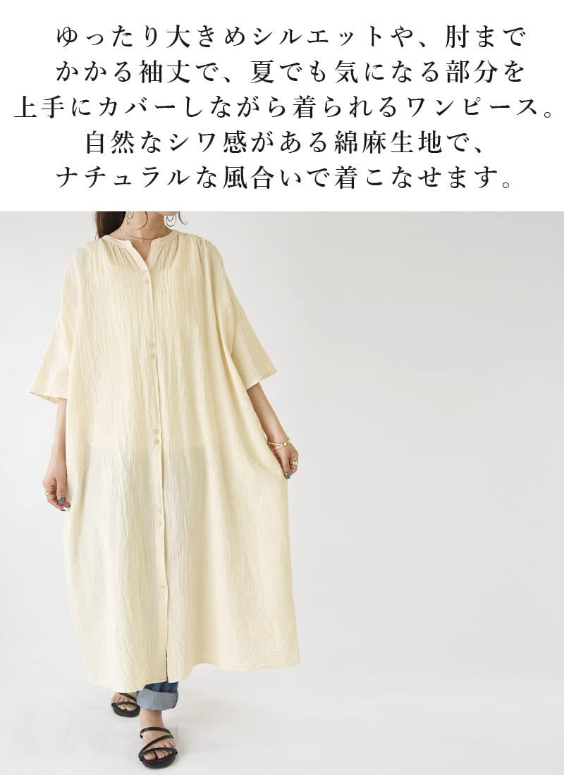 ゆったりサイズ感で、ナチュラルなシャツワンピ。インドコットンリネン生地で、夏でも涼しく爽やかな着心地に◎