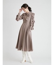 シワになりにくいポリエステル100%タイプライター素材を使用したワンピースは、肩から袖口にかけてと、上身頃にフリル端がピコ始末になったラッフルフリルを大胆に施しており、袖のフリルの間と身頃にレースを叩きつけた女性らしいデザイン。モード感のある長めの衿になっており、第一釦のメタル釦がアクセントに。後ろウエストには共ひもリボンがついているのでお好みでウエストを絞ったり調節が可能です。ウエスト位置を高めに設定して裾にかけてフレアーで広がったシルエット。インナーキャミワンピース付きです。 ※照明の関係により、実際よりも色味が違って見える場合があります。 またパソコン・スマートフォンなどの環境により、若干製品と画像のカラーが異なる場合もございます。予めご了承ください。 商品の色味は、商品単品画像をご参照下さい。 ※商品画像はサンプルのため、色味やサイズ等の仕様に変更がある場合がございますので、予めご了承ください。