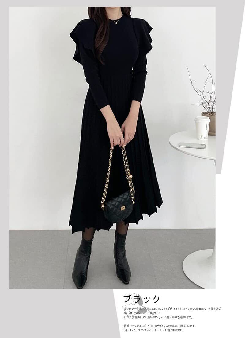 [polar lander] ニット ワンピース 秋冬 レディース きれいめ 着瘦せ 長袖 プリーツワンピース 上品 Aライン ロングス 可愛らしいフリル セーターワンピース