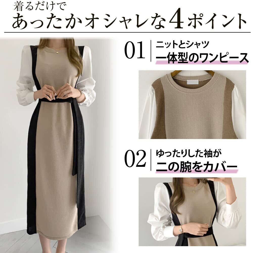 [Ressh.N] ニット ワンピース レディース ミモレ丈 シャツ袖一体型 春秋 きれいめ バイカラー