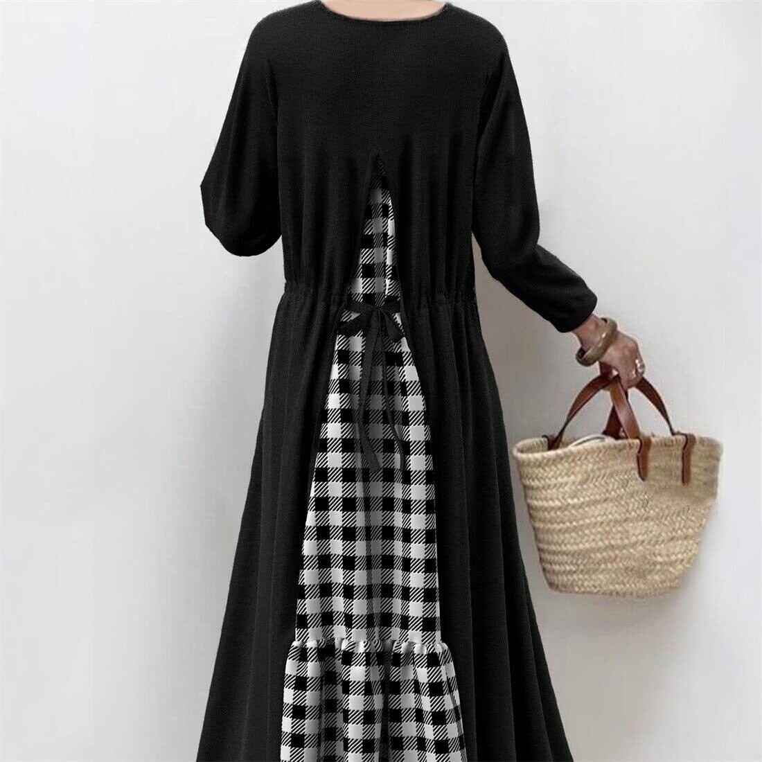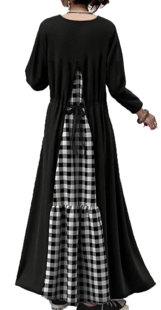 【数量限定】[JINPIN]ワンピース レディース ロングワンピース マキシワンピース フリルワンピース ドレス フレアワンピース ドッキング プリーツ ギャザー ミモレ丈 バックスリット チェック 重ね着風 切り替え 長袖 カジュアル ボタン 春秋冬 | BOSSO