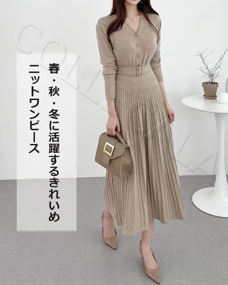 [Collecala] ニットワンピース レディース秋冬きれいめ 上品ワンピース プリーツ模様 ウエストマーク ベルト付き ハイウエスト Aライン Vネック ニット ミモレ丈 着痩せセーターワンピース