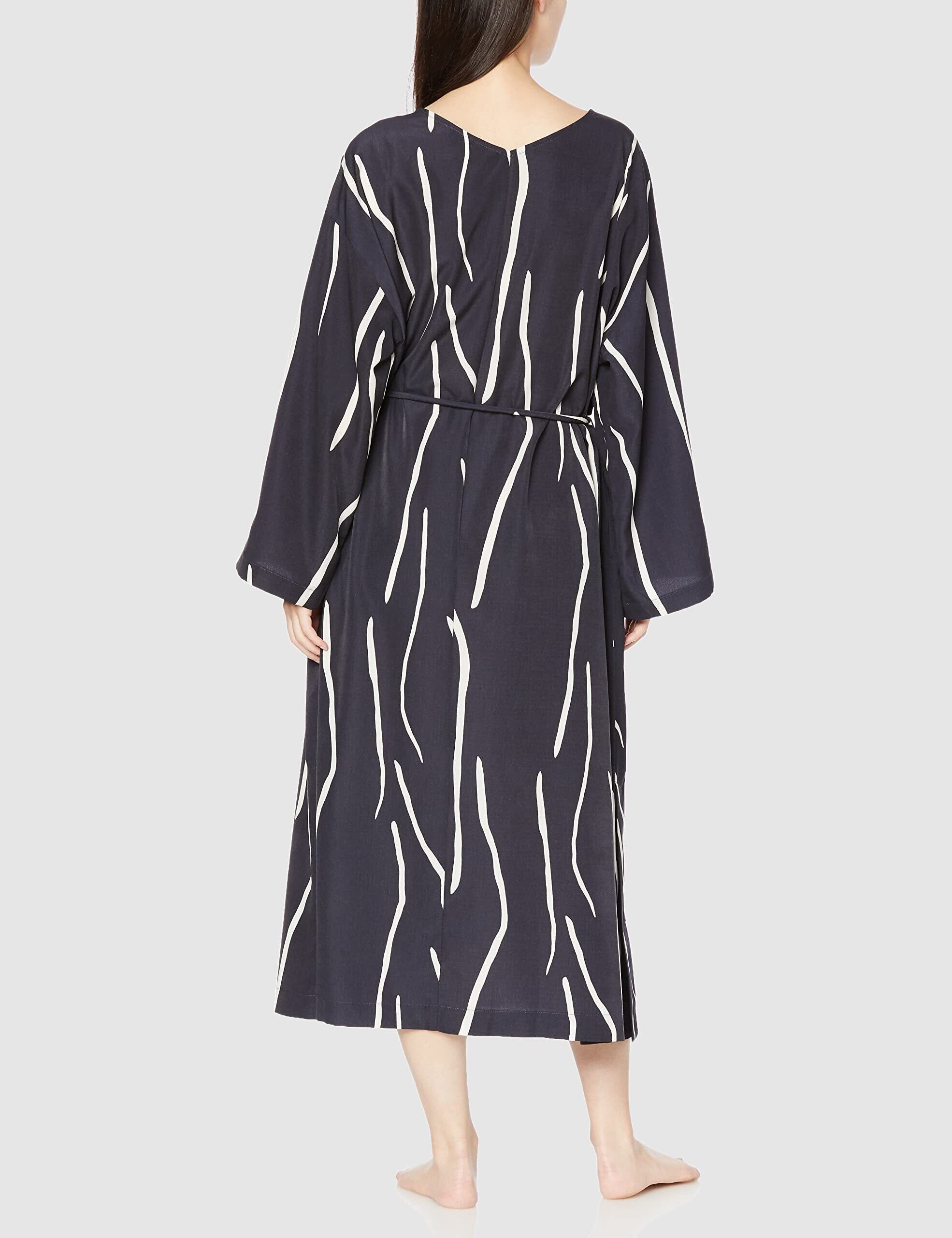 マットでなめらかな生地に、流れるようなラインモチーフを描いたシックなルームウェアシリーズです。ゆったりと開けたVネックが首元を美しく見せてくれるワンピースは、春先から夏までさらっと着られるロング丈。比翼仕立てですっきりとした前立てのデザインで、ちょっとしたワンマイルウェアとしてもご使用いただけます。腰元には小さなロゴ刺繍も添えました。色はクールなネイビーとUSAGI ONLINE限定のオフホワイトの2色からお選びいただけます。同柄のロングパンツと合わせてお楽しみください。
