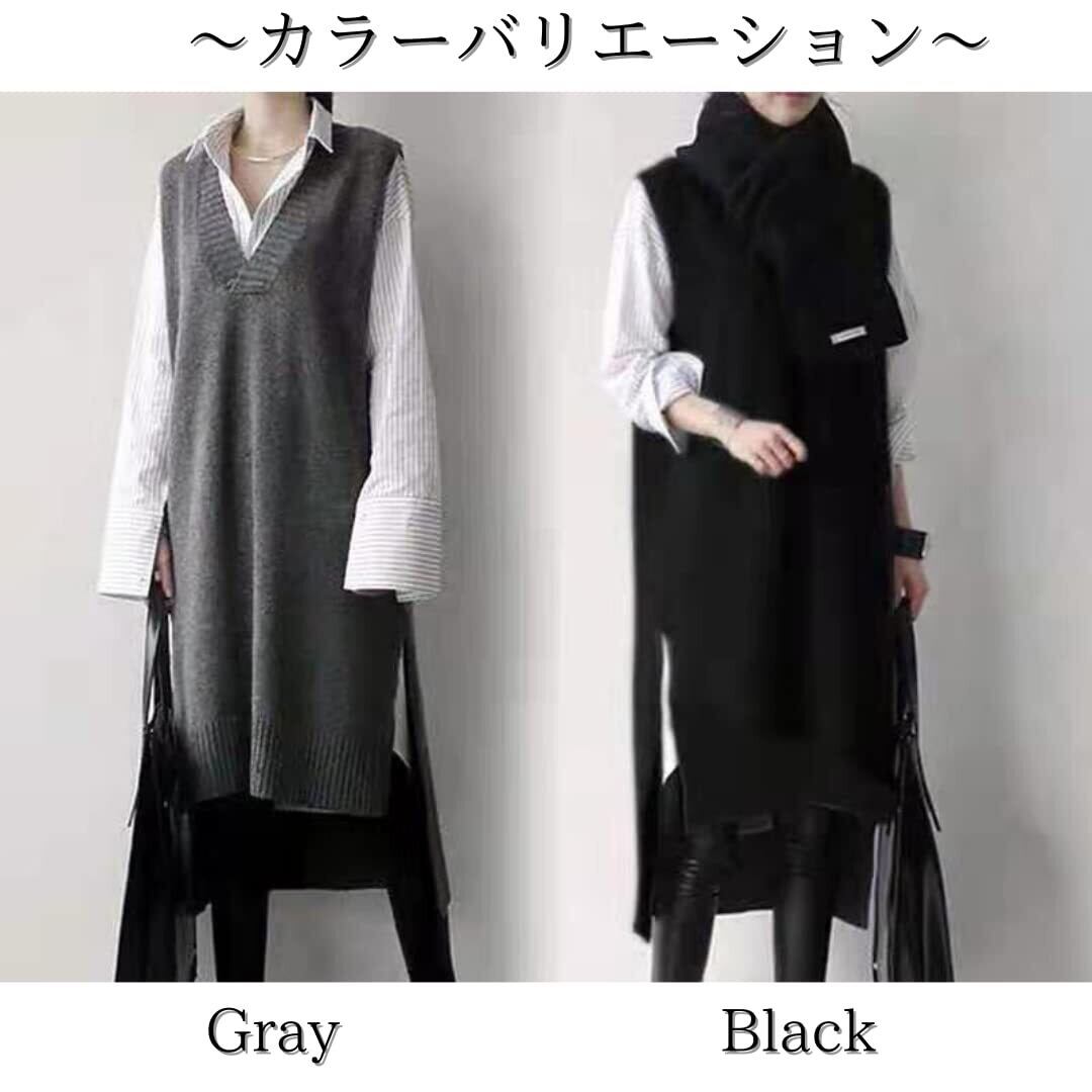 ニットワンピース ジャンパースカート ロング丈 Vネック ノースリーブ レイヤード スリット アシンメトリー 体系カバー トップス
