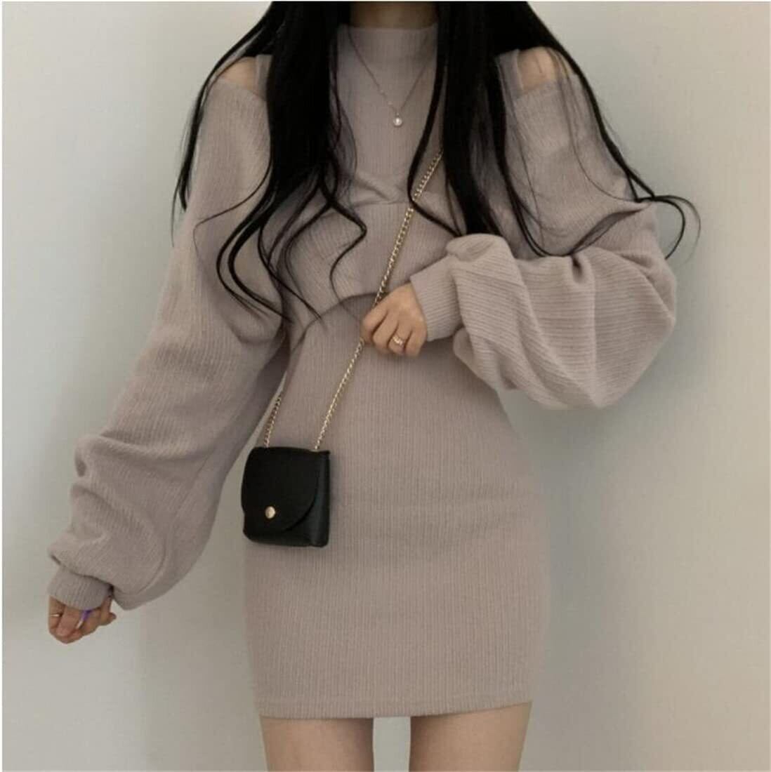 【人気商品】[DYIOPMFGZ] レディース ニットワンピース ミニワンピース タイトワンピース ショートワンピース ワンピース セーター 2点セット ボディコン カシュクール セットアップ トップス ドレス ニット カジュアル セクシー 肩出し 長袖 春秋冬 2way | BOSSO