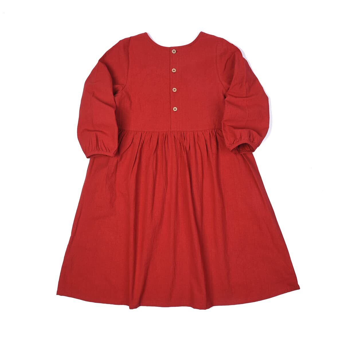 日本製無地生地を使いスカート部分はギャザーでふんわりとしたボリュームを出しています。袖にもボリュームを持たせて、やわらかな印象に仕上げました。