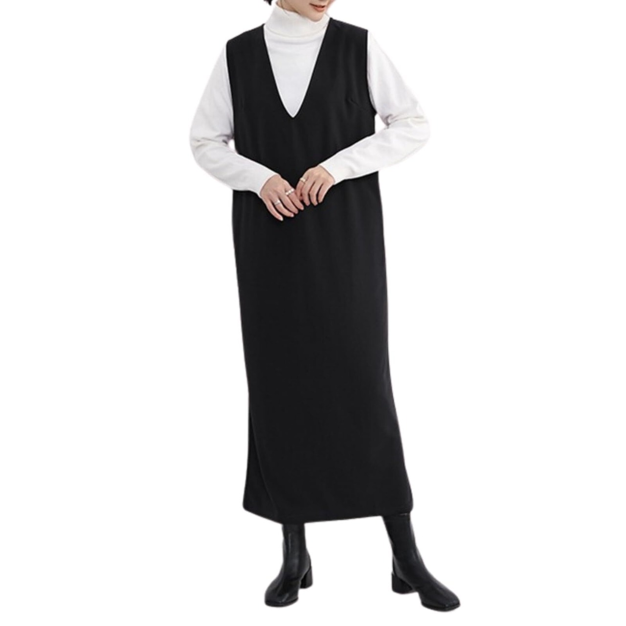 Vネックジャンパースカート。ロング丈のIラインシルエットが大人可愛いワンピース。 インナーのサイズ感を選ばない広めのアームホールデザインに、深めのVネックでモード感のある印象に。スタイリッシュなデザインに仕上げました。 体のラインを拾わないIラインのシルエットでスタイルアップ効果も。