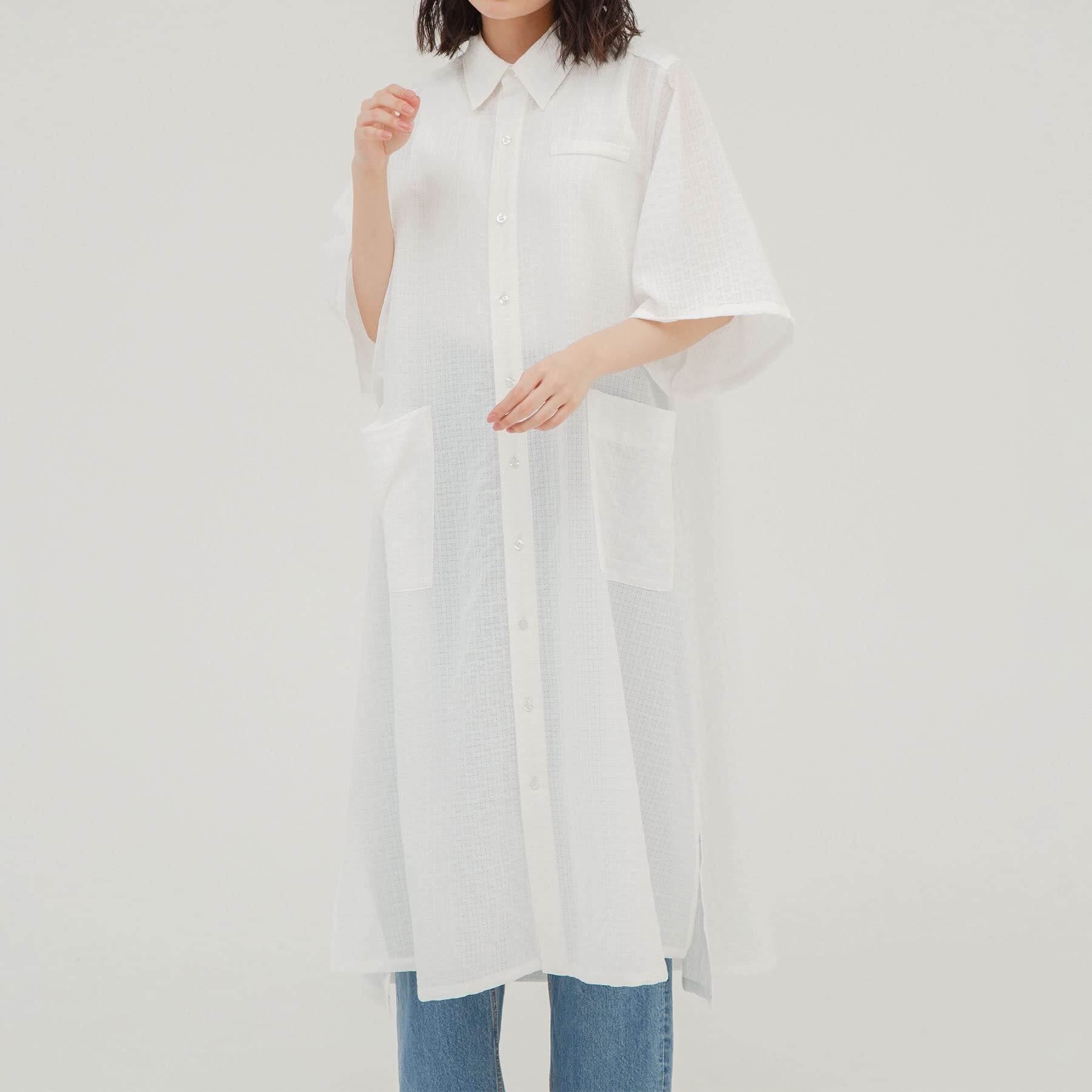 NoraLily定番のボリュームスリーブワンピースにシャツと同じ生地を使用。腰部についたポケットが大きめで使い勝手が良く前を開けて羽織りとして着用することも可能なので、性別に関わらず着用して頂けます。 無地は生地の織りでチェック柄を表現したサッカー素材で涼し気な雰囲気に仕上げました。 チェック柄も薄手でさらっとしたものを使用し、こちらも清涼感のある一枚になっています。