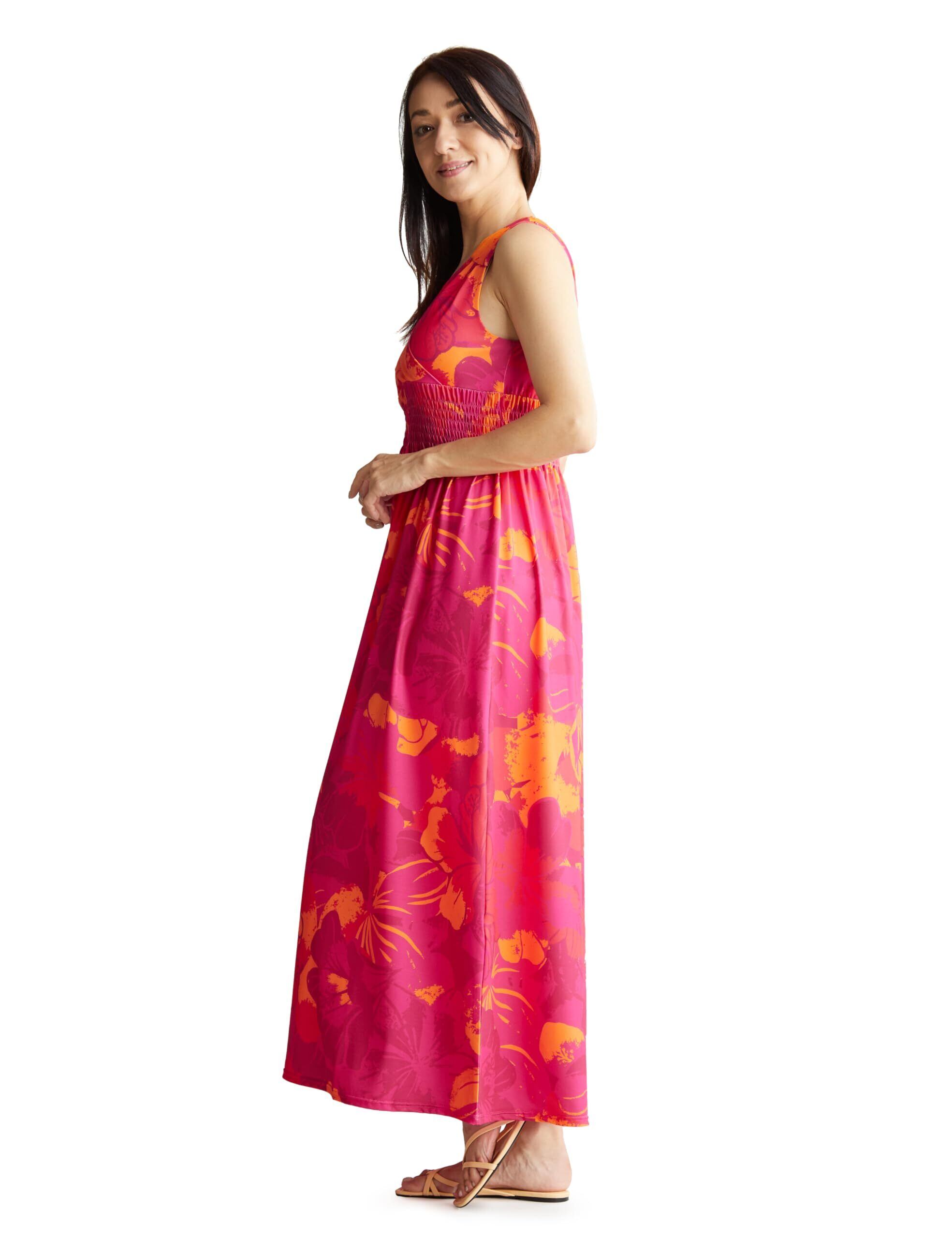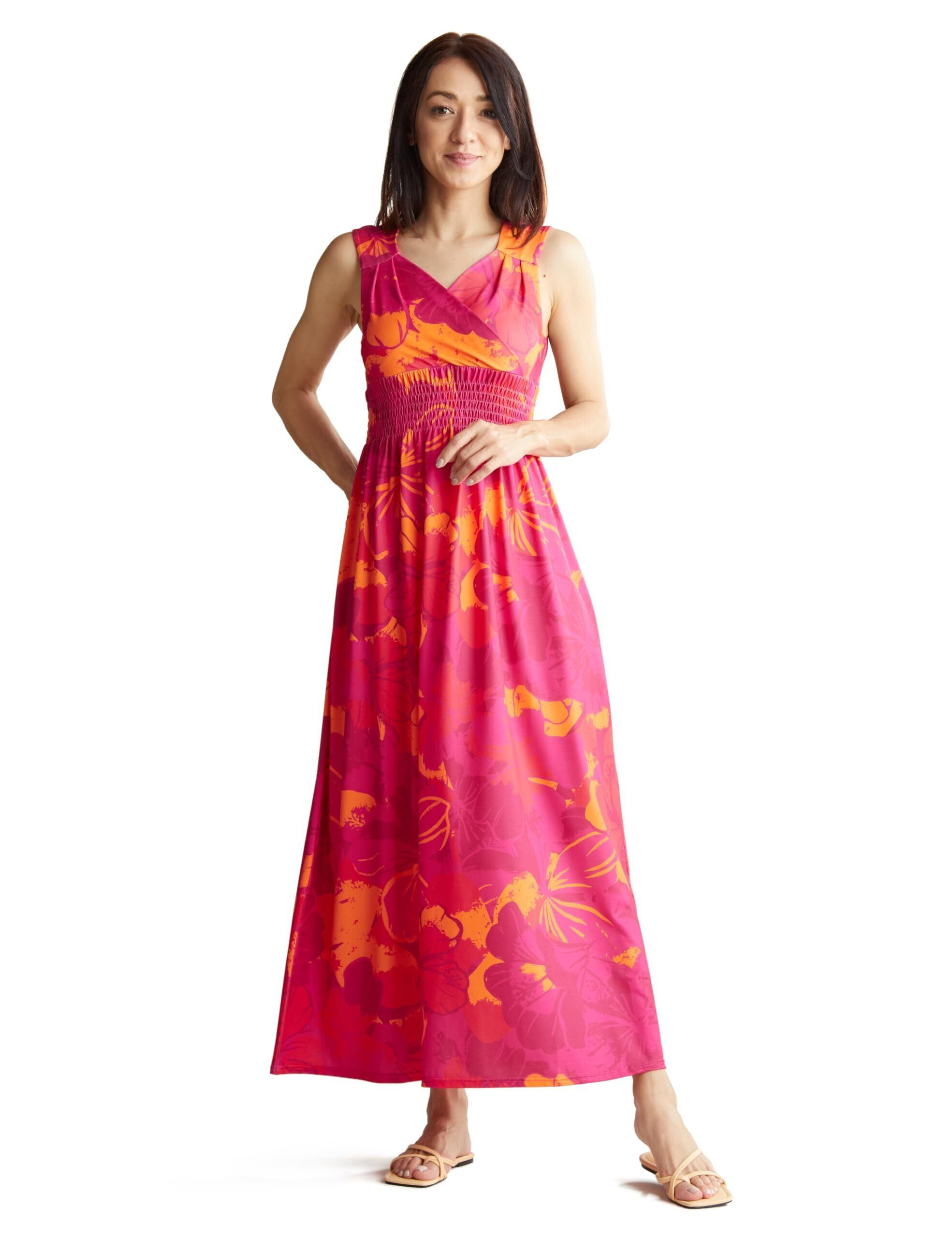 カシュクールの上半身がすっきりと美しいシルエット。切替えにより胸元が広がりすぎず程よく安定したVネックに仕上がります。高めのウエスト切替えでスタイルアップ。程よいフレア感で動きやすく上品なデザインです。足下からの着脱が可能です。メイクやヘアスタイルを崩しません。「プアアロアロ」ビビッドカラーを効かせたダイナミックなハイビスカス(アロアロ)のアートワーク。幾重にも重ねた奥深い色層がポリネシアンムードを際立たせます。ヴィンテージ・ムウムウを想わせるノスタルジックさとトレンド感をミックスしたデザインに仕上げまし